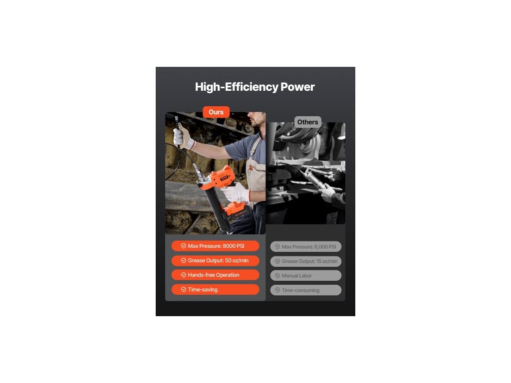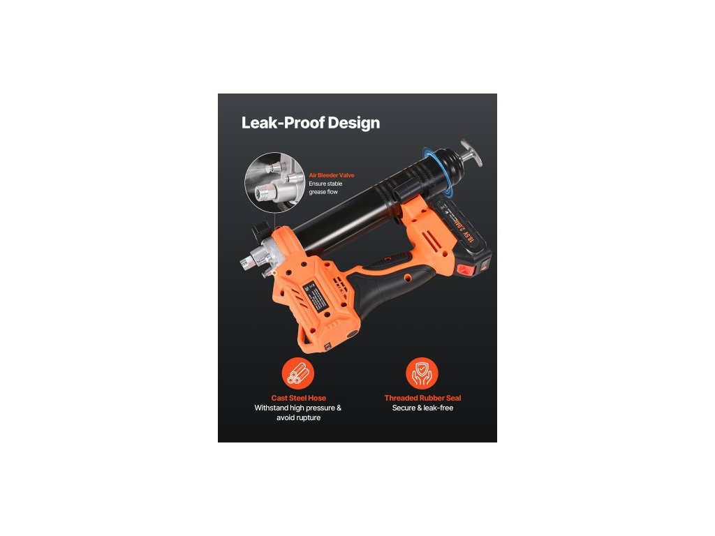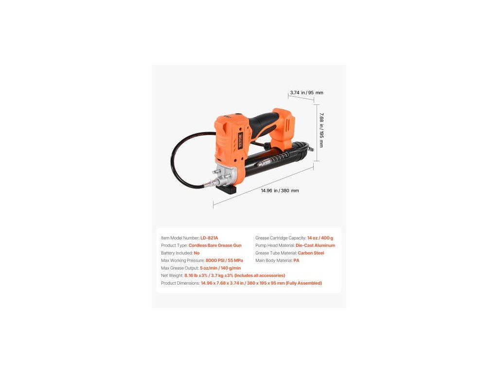 Materiál hlavy čerpadla: Tlakově litý hliník, Materiál tuby s mazivem: Uhlíková ocel, Typ produktu: Samotný nástroj, Baterie součástí balení: Ne, Materiál hlavního těla: PA, Číslo modelu položky: LD-821A, Maximální pracovní tlak: 8000 PSI / 55 MPa, Kapacita patrony s mazivem: 14 oz / 400 g, Rozměry produktu: 14,96 x 7,68 x 3,74 palce / 380 x 195 x 95 mm (plně Smontované), Čistá hmotnost: 8,16 lb ±3 % / 3,7 kg ±3 % (včetně veškerého příslušenství), Max. výstup maziva: 5 oz/min / 140 g/min