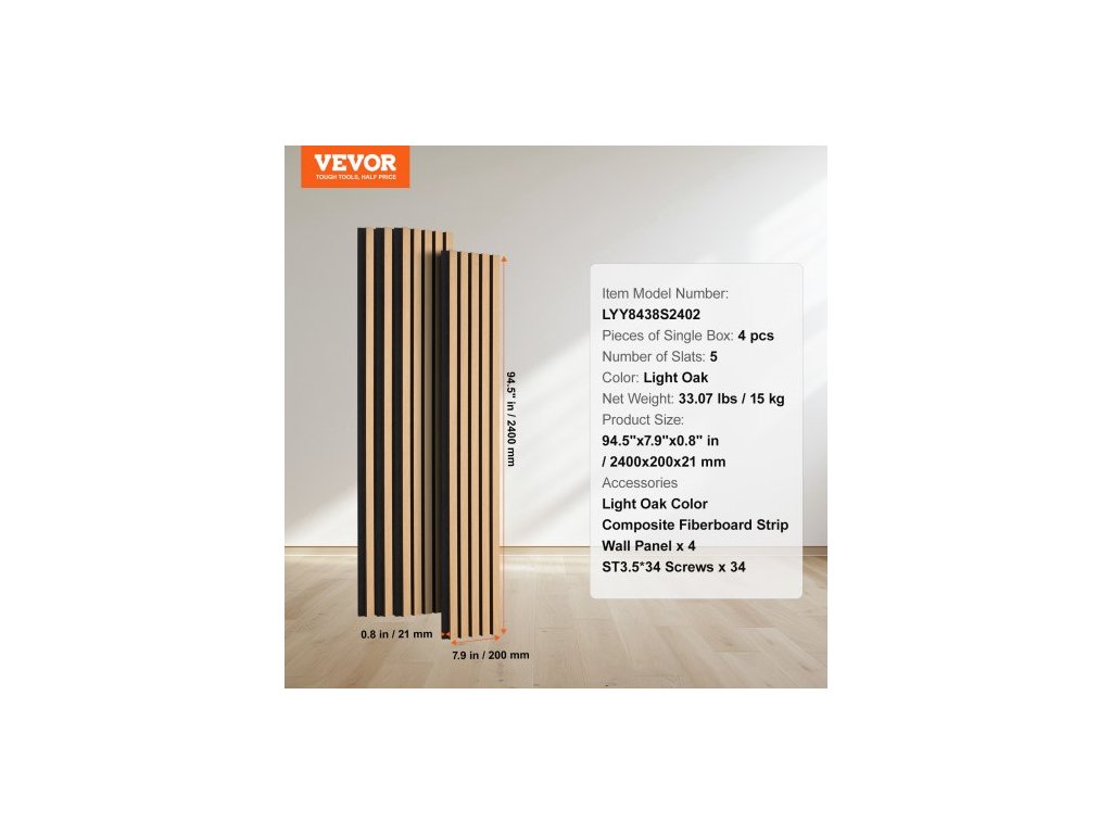 Počet kusů v jedné krabici: 4 ks,Barva: světlý dub,Číslo modelu položky: LYY8438S2402,Počet lamel: 5,Čistá hmotnost: 33,07 lbs / 15 kg,Rozměry výrobku: 94,5"x7,9"x0,8" / 2400x200x21mm