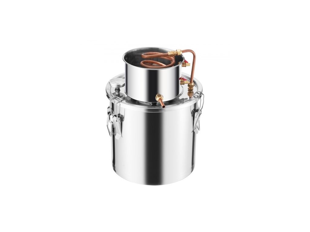 destilační přístroj na alkohol, nerezová palírna na vodu a lihoviny o objemu 19 l s měděnou cívkou, sada pro domácí vaření piva, rafinaci a fermentaci s teploměrem a čerpadlem, na víno, whisky, brandy, stříbrnáKompletní destilační sada