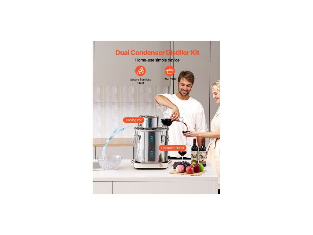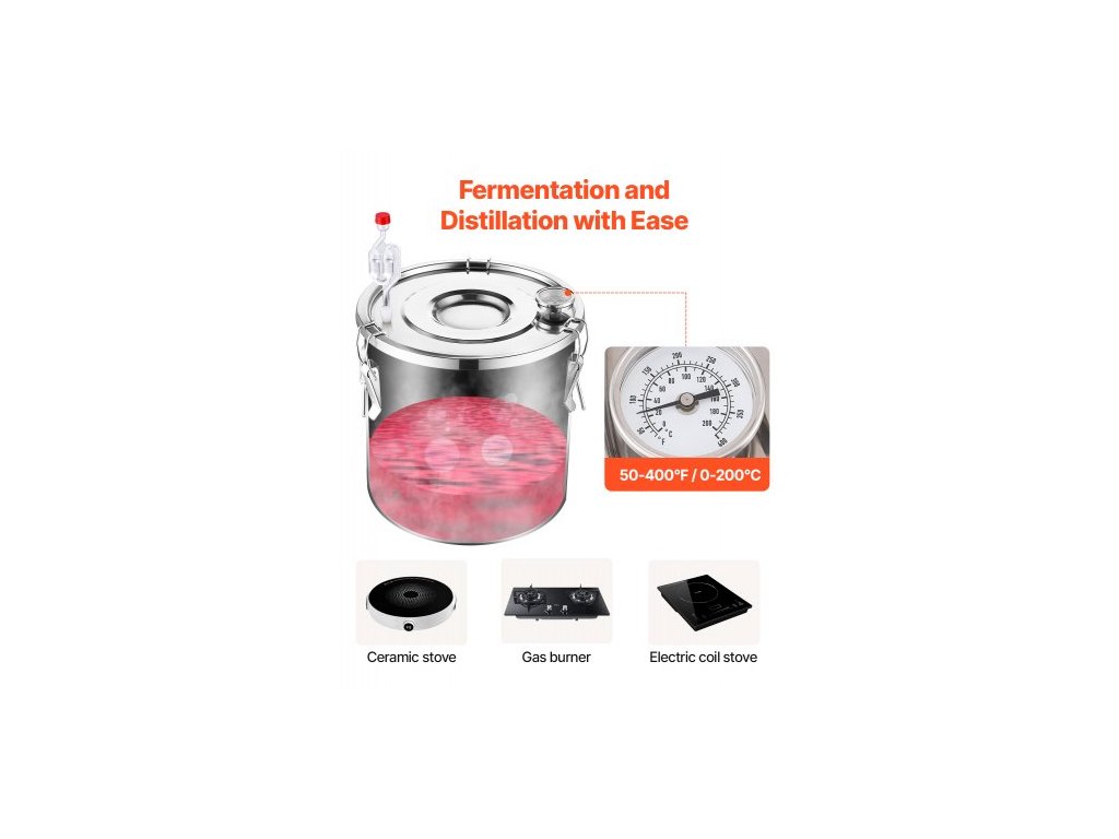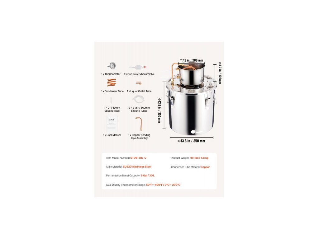 Objem fermentačního sudu: 30 l,Materiál kondenzační trubky: Měď,Rozměry fermentačního sudu: Φ13,8" x 13,8" / Φ350 x 350 mm,Číslo modelu položky: STDB-30L,Rozměry chladicí nádoby: Φ7,9" x 4,3" / Φ200 x 110 mm,Hmotnost výrobku: 4,0 kg,Rozsah teploměru: 50°F~400°F / 0℃~200℃, hlavní materiál: nerezová ocel SUS201