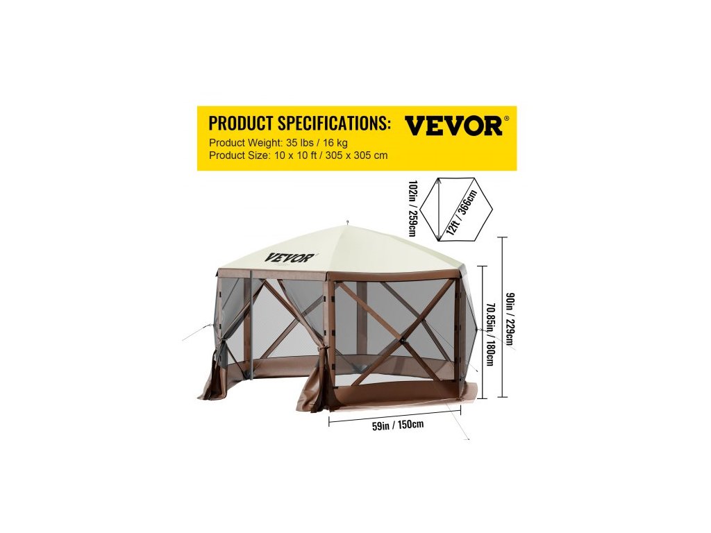 Max. výška: 90" / 2,29 m,Rozměry: 10 stop x 10 stop / 3,05 m x 3,05 m,Šířka na každou stranu: 71" / 1,8 m,Model: VV-CGT-1010,Materiál: Oxfordská tkanina 300D a gázová síťovina B3,Maximální krytí: 8 osob,Hmotnost: 35 liber / 16 kg