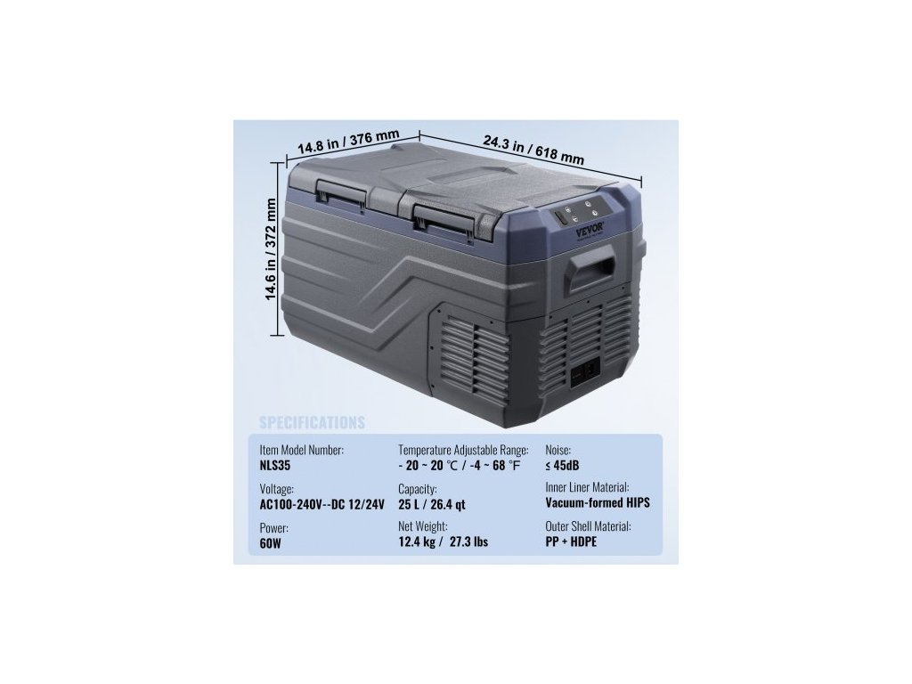 Materiál vnějšího pláště: PP + HDPE,Nastavitelný rozsah teploty: -20 ~ 20 ℃ / -4 ~ 68 ℉,Materiál vnitřní vložky: Vakuově tvarovaný HIPS,Objem: 25 l / 26,4 qt,Hlučnost: ≤ 45dB,Napětí: AC100-240V (50/60Hz) DC 12/24V,Model položky Číslo: NLS35, Čistá hmotnost: 12,4 kg / 27,3 lbs, Příkon: 60 W, Rozměry výrobku: 618 x 376 x 372 mm / 24,3 x 14,8 x 14,6 palce