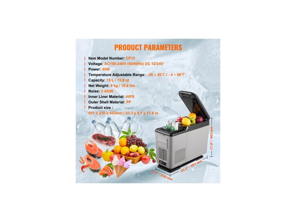 Materiál vnějšího pláště: PP + plech válcovaný za studena, nastavitelný rozsah teploty: -20 ~ 20 ℃ / -4 ~ 68 ℉, materiál vnitřní vložky: reliéfní hliník, objem: 15 l / 15,9 qt, hlučnost: ≤ 45dB, napětí: AC100-240V (50/60Hz) DC 12/24V, číslo modelu položky: CF15, Čistá hmotnost: 9 kg / 19,8 lbs, Příkon: 45 W, Rozměry výrobku: 591 x 230 x 453 mm / 23,3 x 9,1 x 17,8 palce