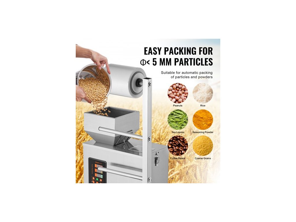 Automatický balicí stroj , 0,002-0,22 lbs/1-100 g, Multifunkční sáček, sáček s práškem, vážící plnící stroj, stroj na plnění prášku pro čaj, semínka, zrna, mouku, fazole a třpytkyNevhodné materiály