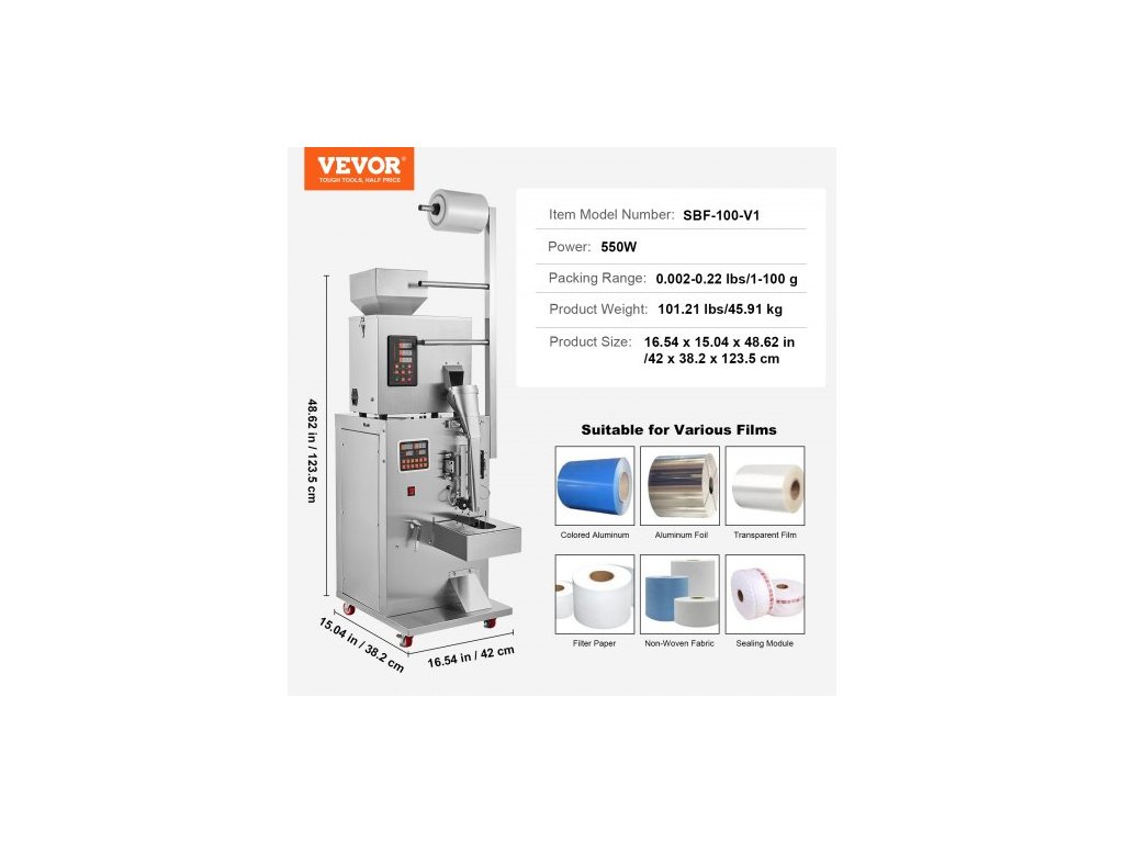 Rozsah balení: 0,002-0,22 lbs/1-100 g,Číslo modelu položky: SBF-100-V2,Hmotnost výrobku: 101,21 lbs/45,91 kg,Příkon: 550 W,Rozměry výrobku: 16,54 x 15,04 x 48,62 palce/42 x 38,2 x 123,5 cm