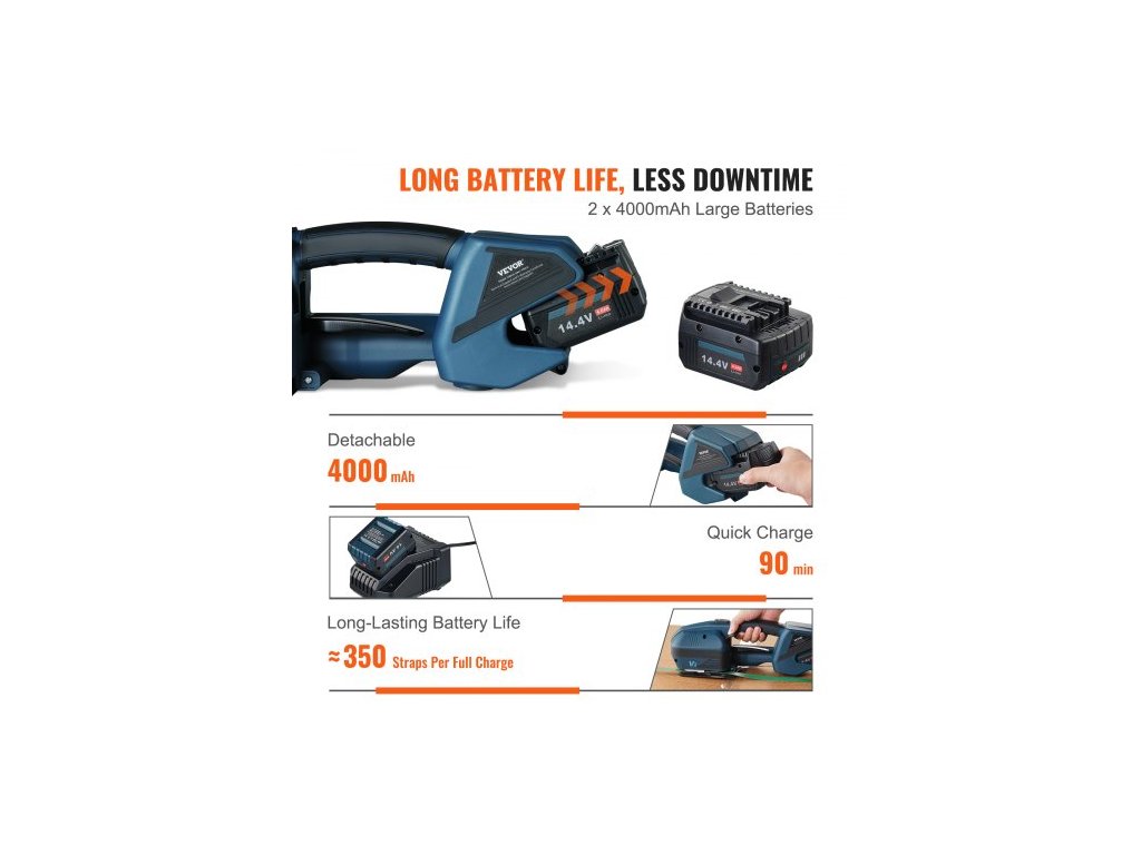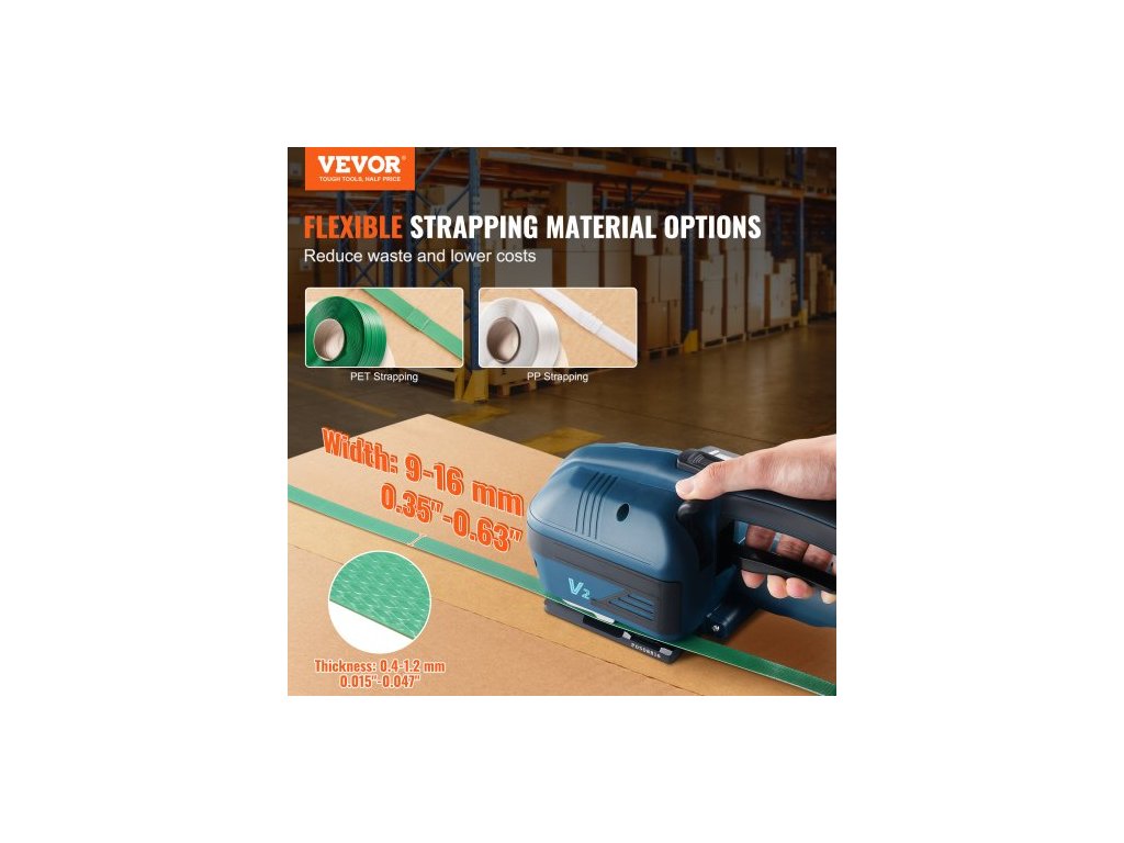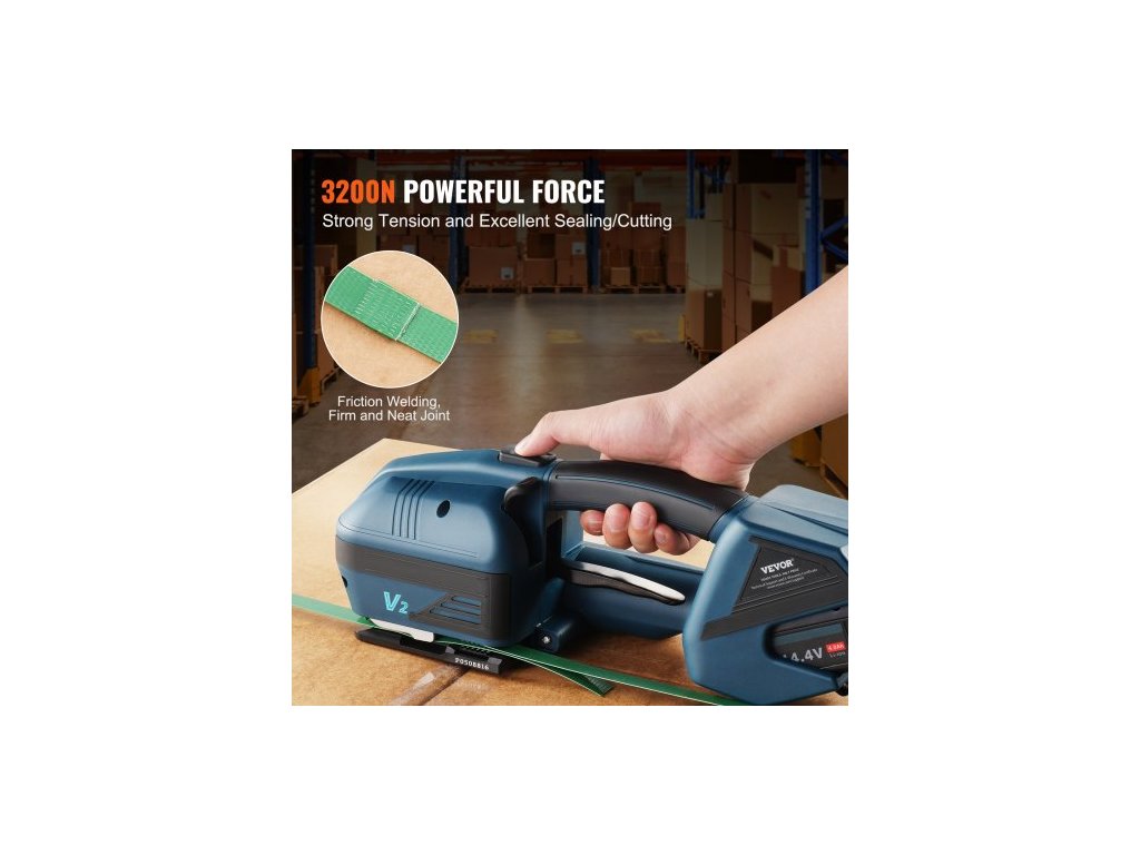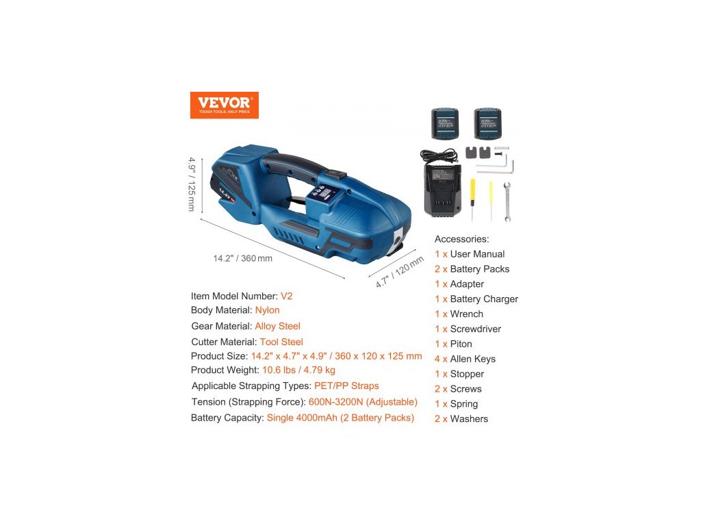 Materiál těla: Nylon,Kapacita baterie: Jedna 4000 mAh (2 baterie),Napětí (síla páskování): 600 N–3200 N (nastavitelné),Číslo modelu: V2,Hmotnost výrobku: 4,79 kg,Materiál řezacího nástroje: Nástrojová ocel,Materiál ozubeného kola: Legovaná ocel,Rozměry výrobku: 360 x 120 x 125 mm,Použitelné typy páskování: PET/PP pásky
