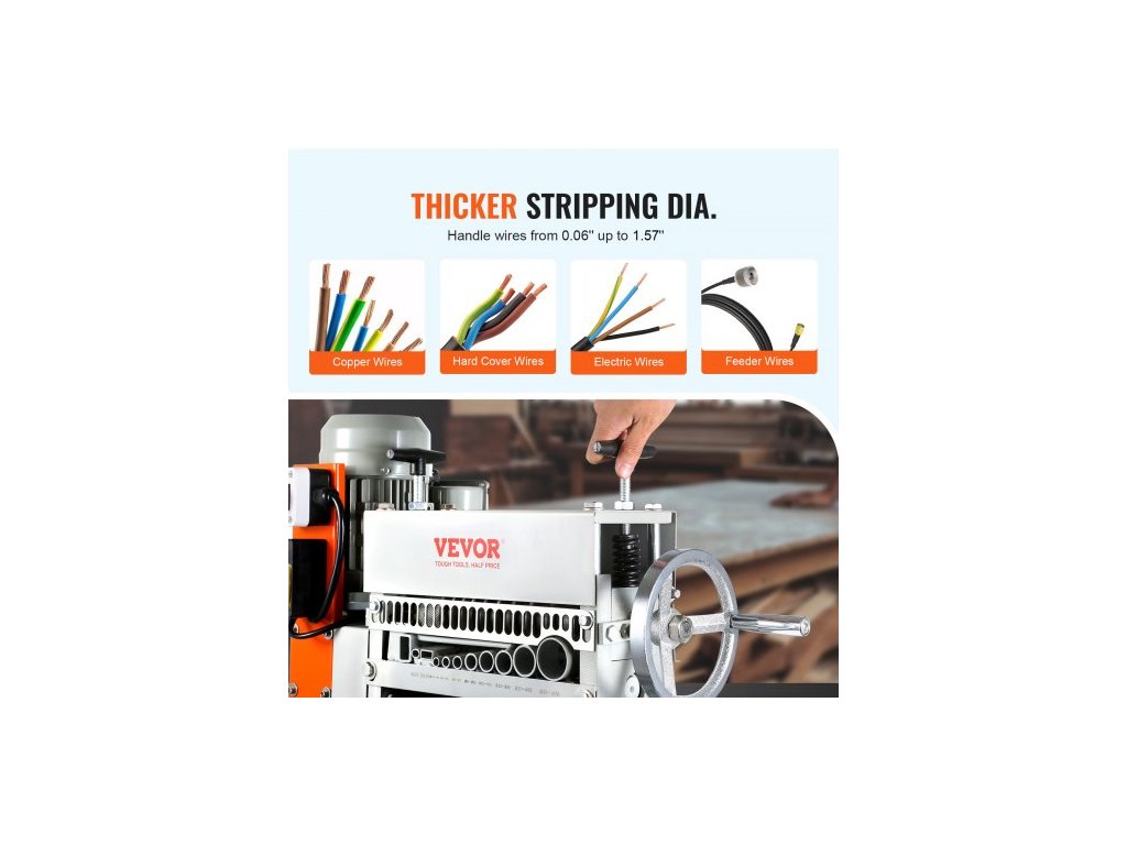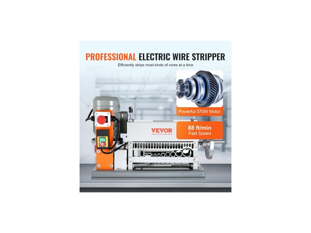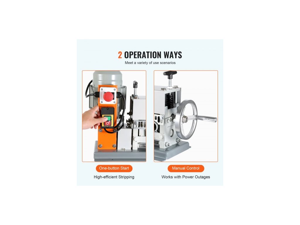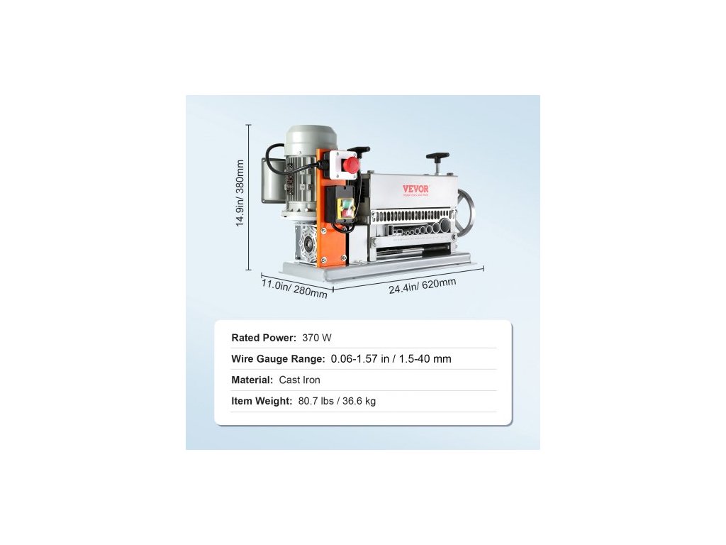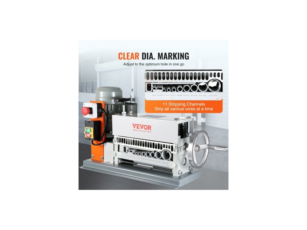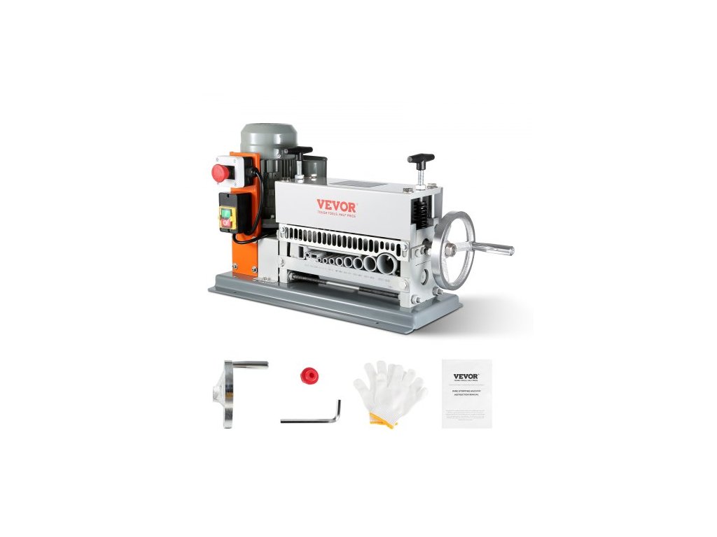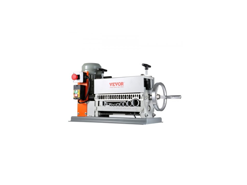 Automatický odizolovací stroj , elektromotorický odizolovací kleště na kabely 1,5 mm–40 mm, 370 W, odizolovací kleště na kabely 26,8 m/min s extra ruční klikou, 11 kanálů pro recyklaci měděného šrotuPevná litinová konstrukce