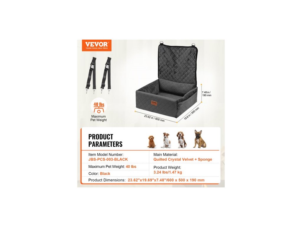 Barva: Černá,Číslo modelu položky: JBS-PCS-003-BLACK,Maximální hmotnost domácího mazlíčka: 18 kg,Rozměry výrobku: 600 x 500 x 190 mm (Opěradlo: 670 mm),Čistá hmotnost: 1,47 kg,Hlavní materiál: Ultrazvukem prošívaný krystalový samet + houbička
