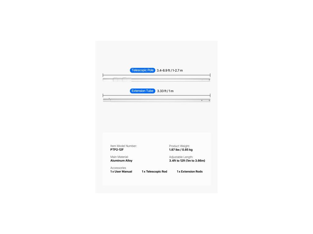 Prodlužovací trubice: 1 m, Teleskopická tyč: 1065 mm (minimální délka), Číslo modelu položky: PTP2-12F, Hmotnost výrobku: 0,85 kg, Hlavní materiál: Hliníková slitina, Nastavitelná délka: 1 m až 3,66 m