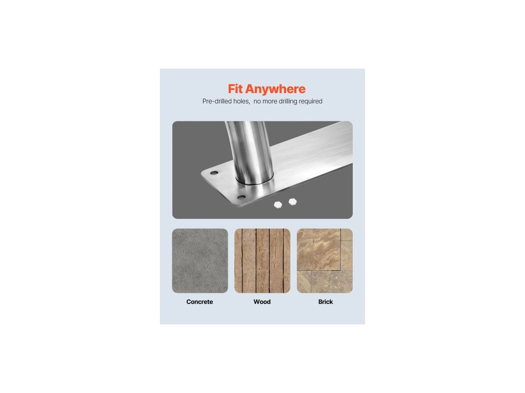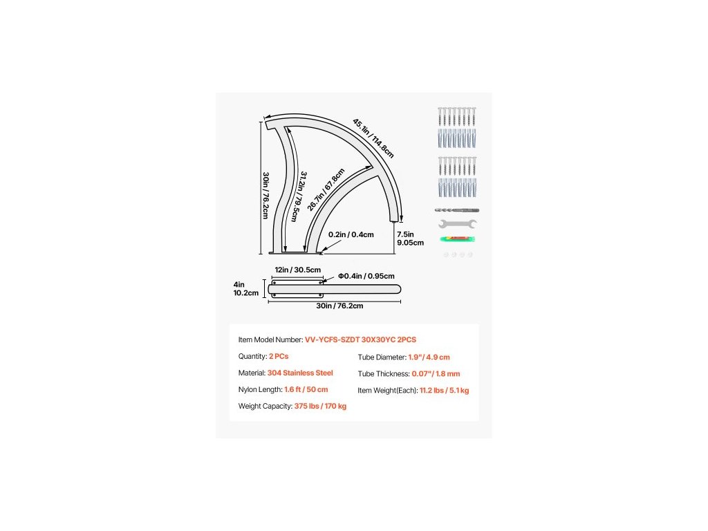 Hmotnost položky (každý): 11,2 liber / 5,1 kg, Nosnost: 375 liber / 170 kg, Rozměry základní desky: 12"D x 4"Š / 30,5 x 10,2 cm, Barva: Stříbrná, Model: VV-YCFS-SZDT 30X30YC 2 ks, Množství: 2 ks, Materiál: Nerezová ocel 304, Nylon, Délka: 1,6 stopy / 50 cm,Průměr předvrtaného otvoru: 9,5 mm,Tloušťka trubky: 1,8 mm,Rozměry výrobku: 76,2 x 76,2 cmD x 76,2 cmV,Průměr trubky: 4,9 cm