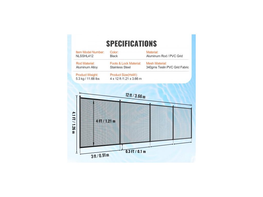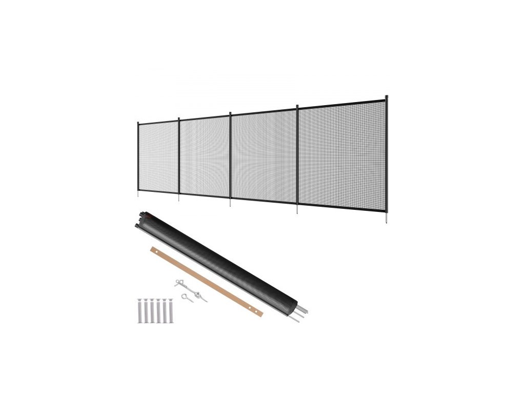 1× Pomocná instalační měrka:,Barva: Černá,Materiál pletiva: 340gms Teslin PVC mřížková tkanina,Číslo modelu položky: NLSSHL412,Hmotnost výrobku: 5,3 kg/11,68 lbs,6 x chránič nohou:,Materiál: Hliníková tyč/PVC mřížka,Materiál tyče: Hliníková slitina,Materiál nohou a zámku: Nerezová ocel,6 x krytky chráničů nohou:,Rozměry výrobku (V x Š): 4x12 stop / 1,21x3,66 m