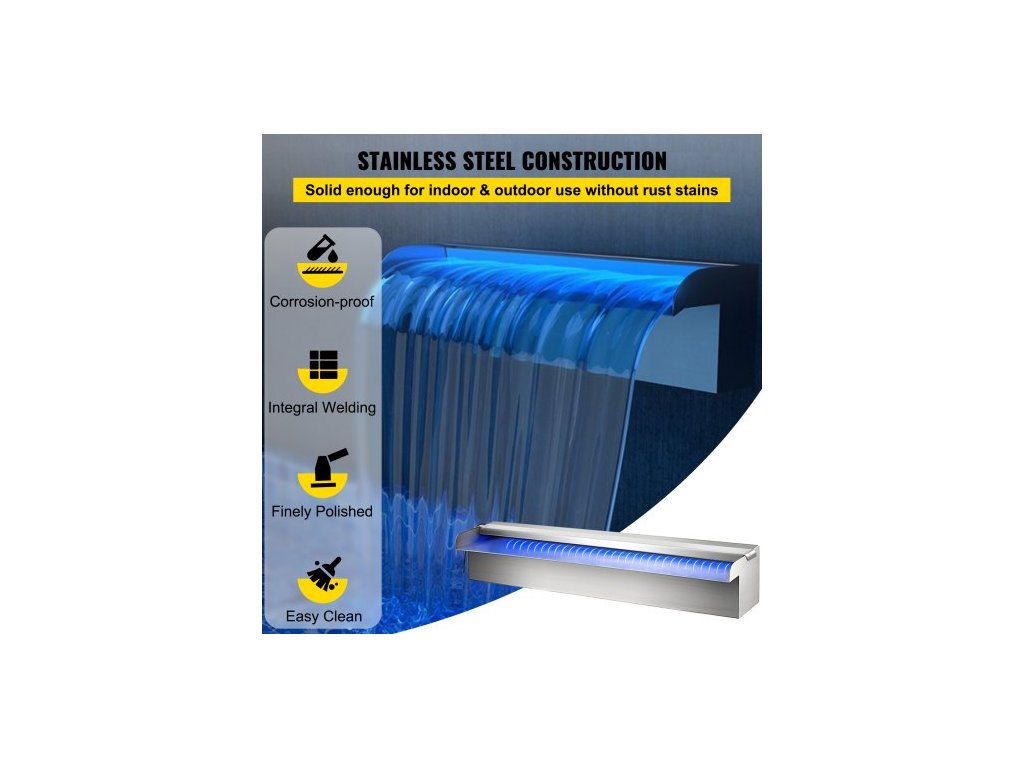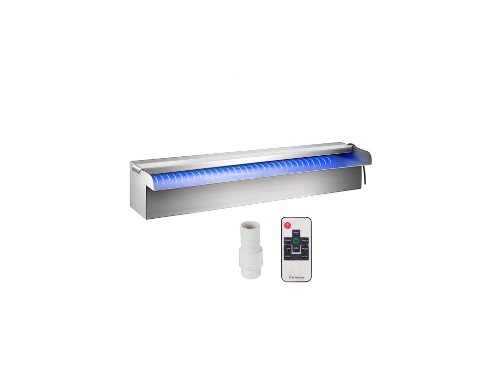 Bazénový vodopádový přeliv 30x11,5x8 cm z nerezové oceli s barevným LED páskem, hadicovou přípojkou, dálkovým ovládáním, odolný proti korozi pro jezírko, venkovní zahraduMateriál z nerezové oceli