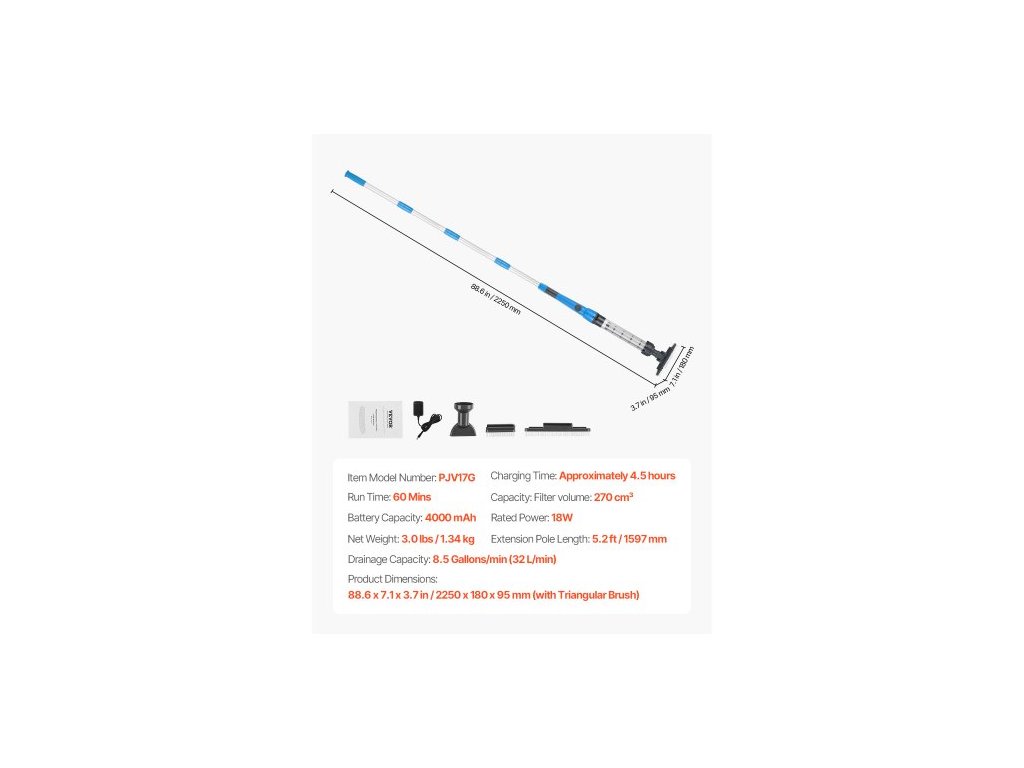 Délka prodlužovací tyče (celková): 5,2 stopy / 1597 mm,Kapacita baterie: 4000 mAh,Kapacita: Objem filtru: 270 cm³,Odtoková kapacita: 8,5 galonů/min (32 l/min),Číslo modelu položky: PJV17G,Jmenovitý výkon: 18 W,Doba provozu: 60 minut,Rozměry produktu: 88,6 x 7,1 x 3,7 palce / 2250 x 180 x 95 mm (s Trojúhelníkový kartáč),Doba nabíjení: Přibližně 4,5 hodiny,Čistá hmotnost: 1,34 kg