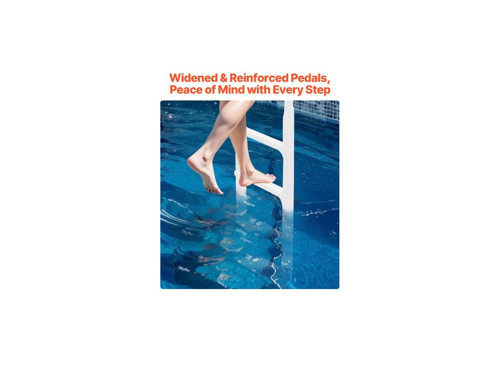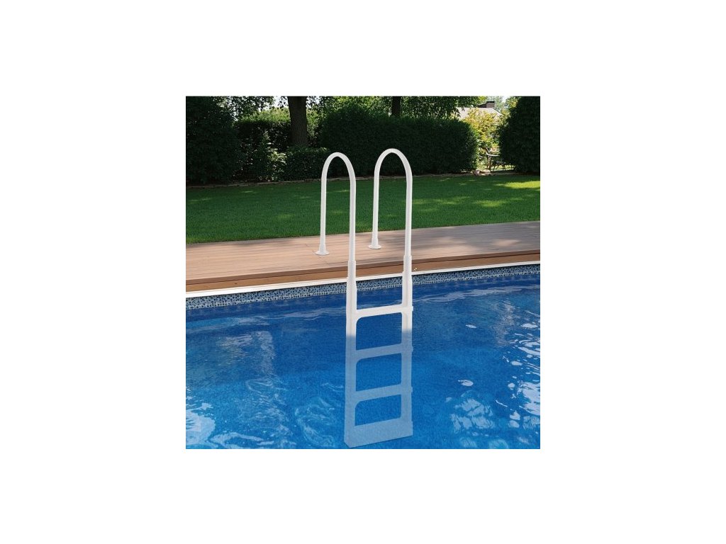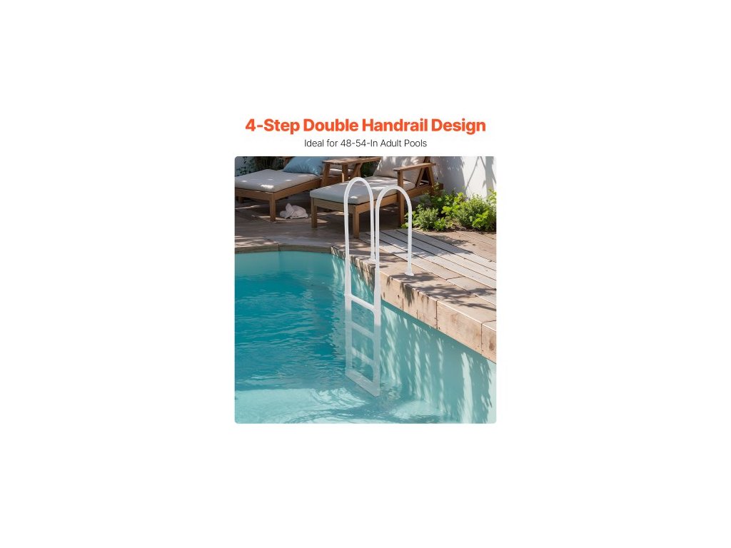 Bazénový žebřík , 4stupňový schod s dvojitým madlem, protiskluzové zesílené odolné schody, nosnost 136 kg, pro zapuštěné a nadzemní bazény o rozměrech 122–147 cm s jakýmkoli povrchem terasy, vnitřní i venkovníUživatelsky přívětivá konstrukce