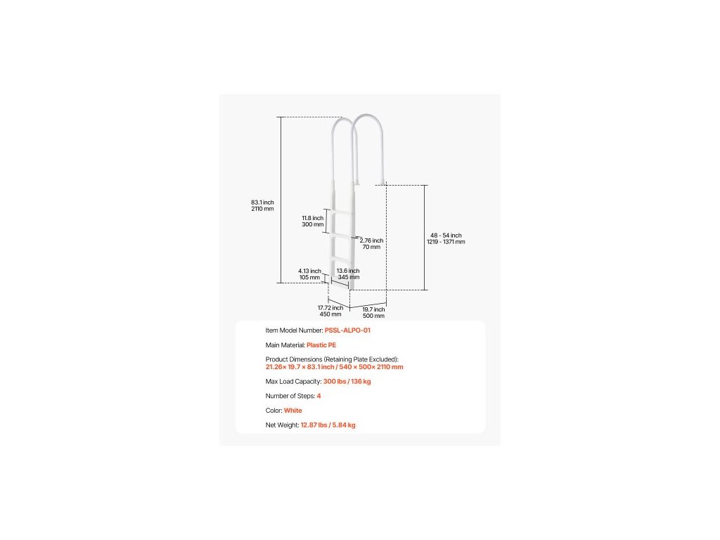 Rozměry produktu (bez montážní základny): 540 x 500 x 2110 mm,Počet schodů: 4,Barva: Bílá,Číslo modelu položky: PSSL-ALPO-01,Maximální nosnost: 136 kg,Čistá hmotnost: 5,84 kg,Hlavní materiál: Plast PE