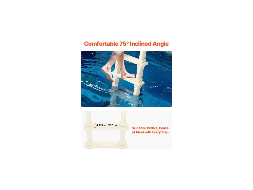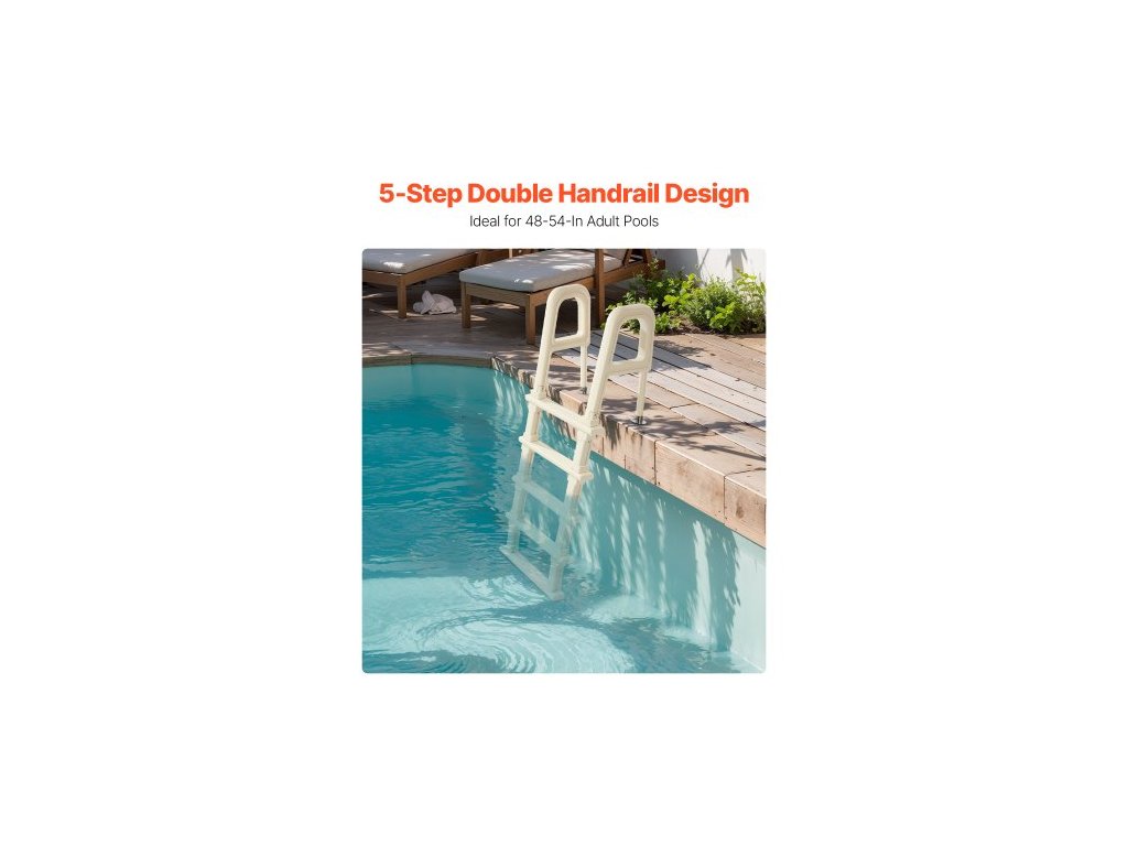 Bazénový žebřík , sklon 75°, 5stupňové schody s dvojitým zábradlím, protiskluzové, odolné schody, nosnost 136 kg, pro zapuštěné a nadzemní bazény o průměru 122–136 cm s jakýmkoli povrchem terasy, pro vnitřní i venkovní použití.