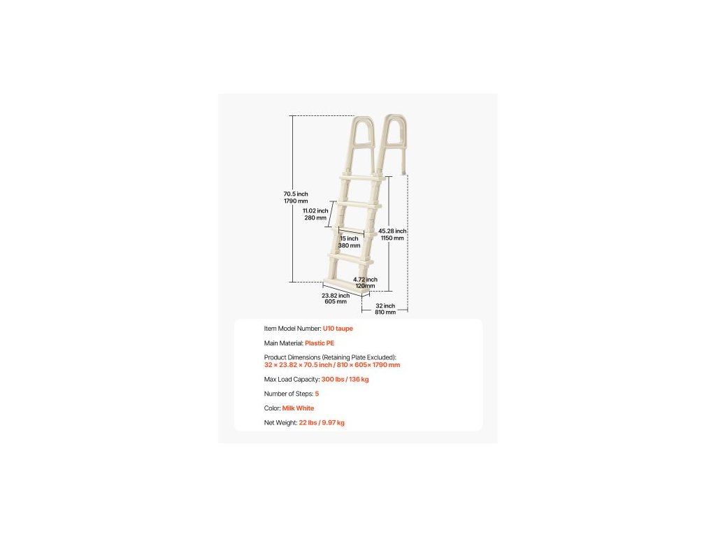 Rozměry výrobku (bez montážní základny): 810 x 605 x 1790 mm,Počet schodů: 5,Barva: Mléčně bílá,Číslo modelu: U10 bílá,Maximální nosnost: 136 kg,Čistá hmotnost: 9,97 kg,Hlavní materiál: Plast PE