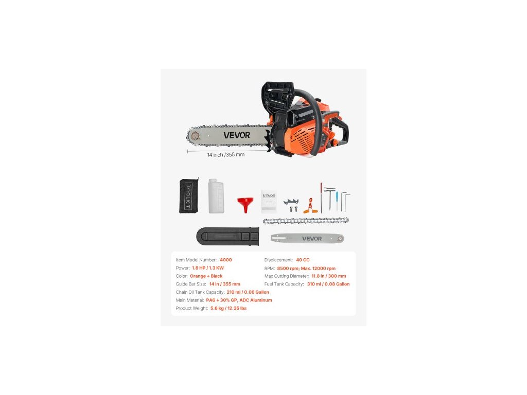 Objem nádrže na olej na řetěz: 210 ml / 0,06 galonu,Maximální průměr řezu: 11,8 palce / 300 mm,Barva: Oranžová + černá,Číslo modelu položky: 4000,Hmotnost výrobku: 5,6 kg / 12,35 lbs,Velikost vodicí lišty: 14 palců / 355 mm,Objem palivové nádrže: 310 ml / 0,08 galonu,Zdvihový objem: 40 ccm,Výkon: 1,8 HP / 1,3 kW, ot./min: 8500 ot./min; max. 12000 ot./min, hlavní materiál: PA6 + 30 % GP, hliník ADC
