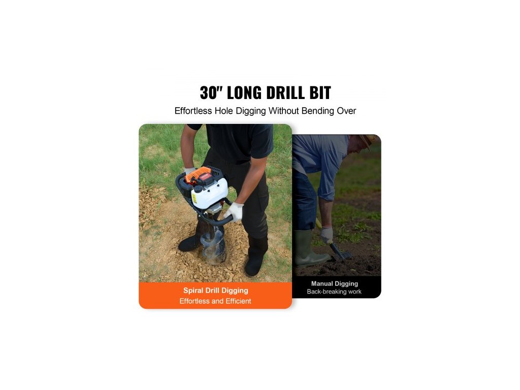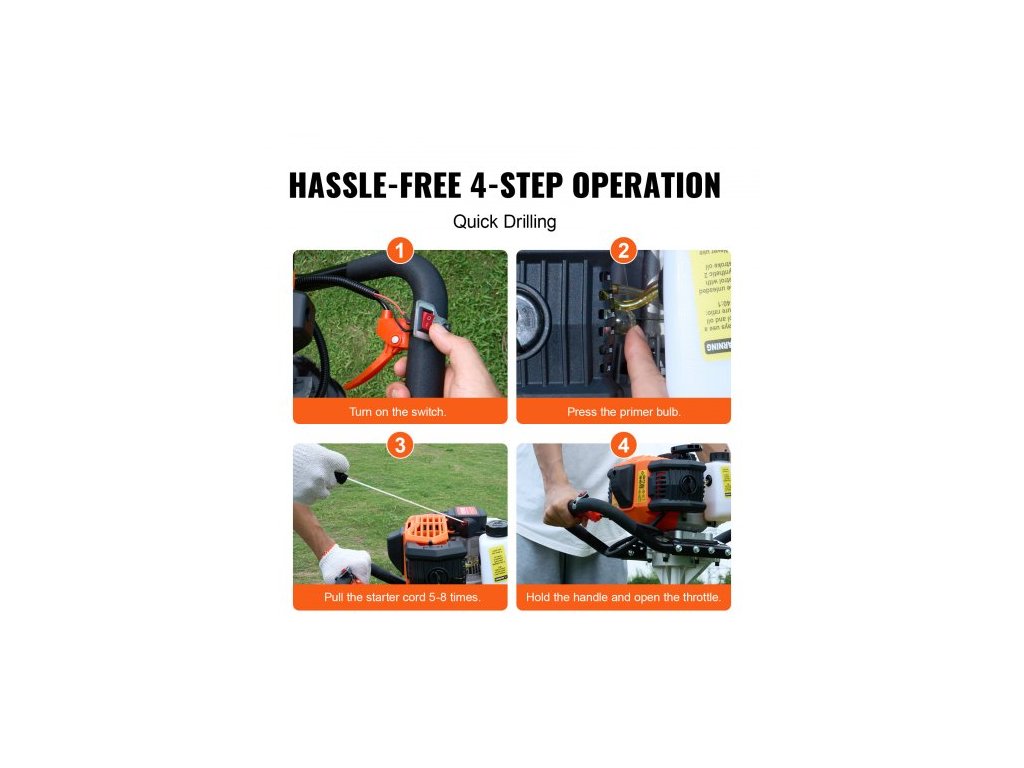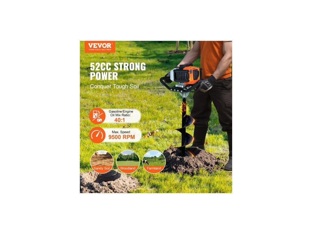vrták na díry do sloupků, benzínový, 52CC 1450W zemní vrták, benzínový vrták s 8” vrtacími bity a 1 prodlužovací tyčí, vrták na díry do sloupků a plotu pro zemědělské a zahradní rostliny, oranžová + černáVysoký výkon