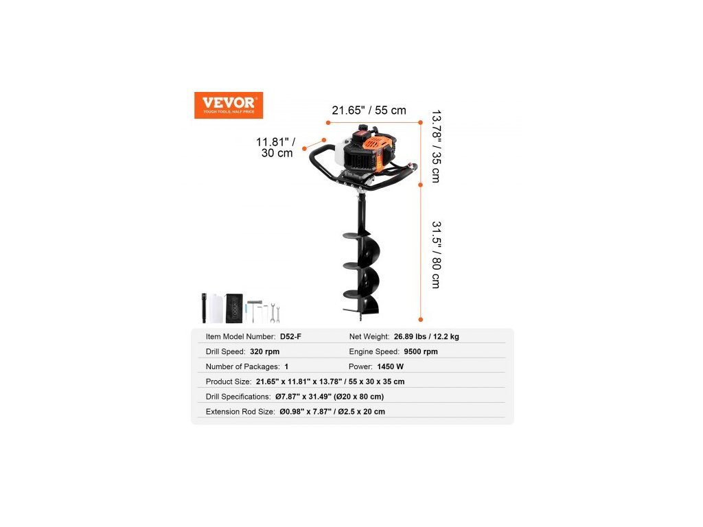 Specifikace vrtáku: Ø7,87" x 31,49" (Ø200 x 800 mm),Rozměr prodlužovací tyče: Ø25 x 200 mm/ ø0,98 x 7,87",Otáčky vrtáku: 320 ot/min,Otáčky motoru: 9500 ot/min,Číslo modelu položky: D52-F,Čistá hmotnost: 26,89 lbs / 12,2 kg,Výkon: 1450 W,Rozměry výrobku: 21,65 x 11,81 x 13,78 palce / 55 x 30 x 35 cm