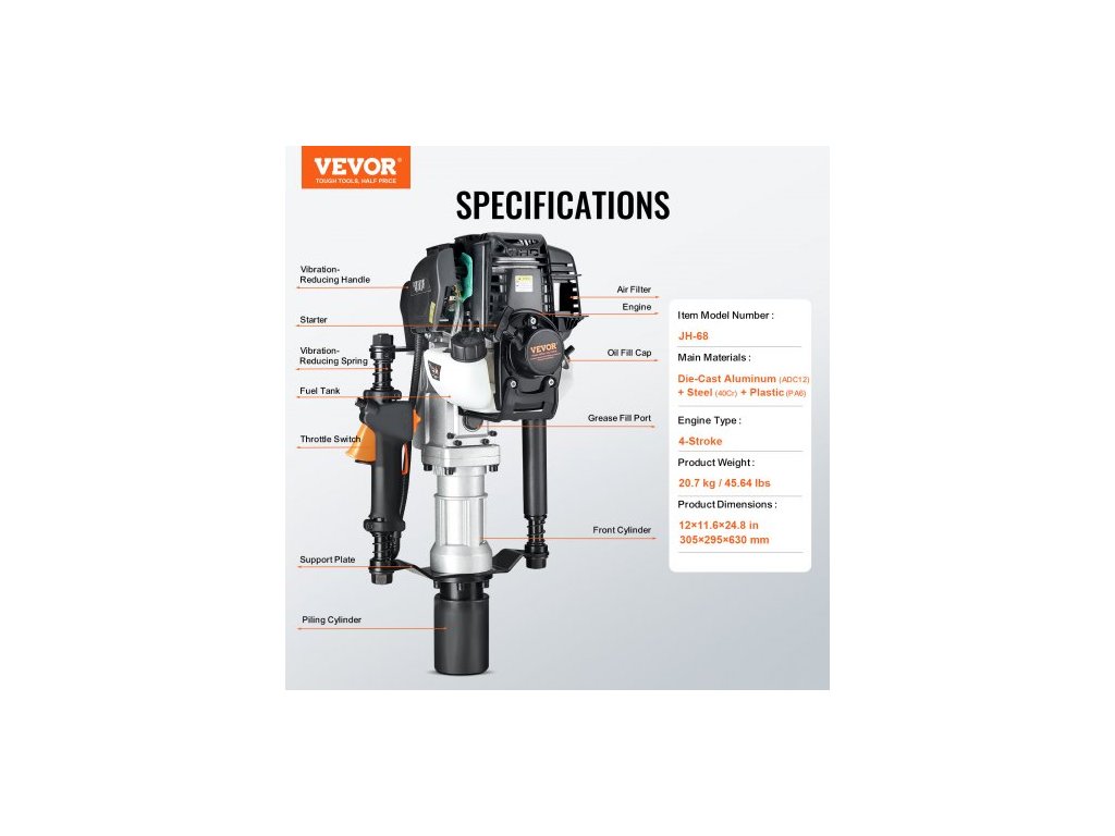 Maximální točivý moment: 1,6 N·m, Energie nárazu: 20–50 J, Maximální otáčky točivého momentu: 6000 ot/min, Rozměry výrobku: 615 x 377 x 480 mm / 24,21 x 14,84 x 18,90 palců, Zdvihový objem: 37,7 ccm, Typ motoru: Čtyřtaktní, Hlavní materiály: Tlakový odlitek hliníku + ocel + plast, Jmenovité otáčky: 6500 Otáčky/min, Průměry pouzder pro piloty včetně: 55 mm, 70 mm, Číslo modelu položky: JH-68, Objem palivové nádrže: 0,65 l ± 5 %, Jmenovitý výkon: 1 kW ± 5 %, Frekvence úderů: 2400–3000 BPM, Čistá hmotnost: 20,7 kg / 45,64 lbs
