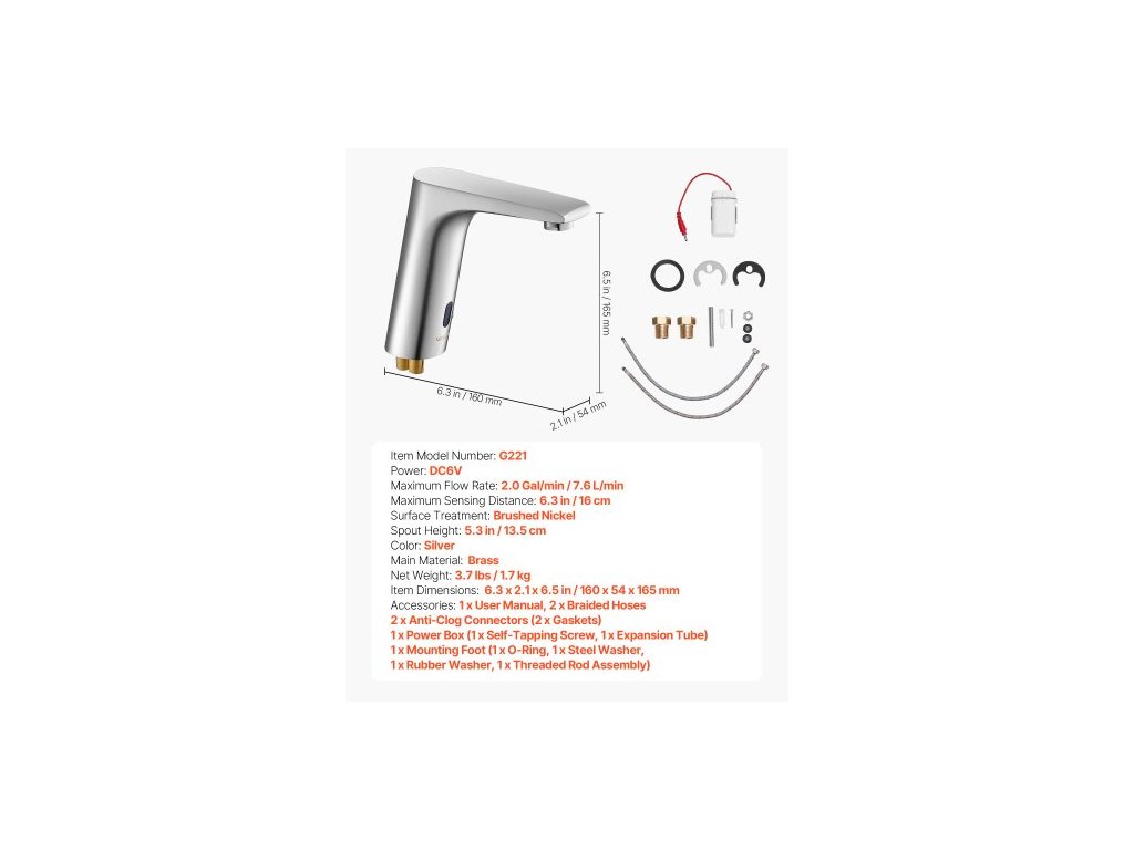 Velikost hadicové přípojky: 9,5 mm, Výška výtoku: 13,5 cm, Délka hadice: 600 mm, Snímací vzdálenost: až 16 cm, Barva: stříbrná, Číslo modelu: G221, Maximální průtok: 7,6 l/min, Povrchová úprava: kartáčovaný nikl, Rozměry: 160 x 54 x 165 cm mm, Čistá hmotnost: 3,7 lbs / 1,7 kg, Hlavní materiál: Mosaz, Napájení: DC 6V (4 x AA alkalické baterie, nejsou součástí balení)