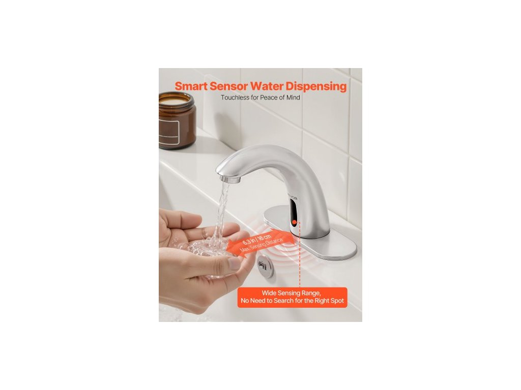 Bezdotyková umyvadlová baterie , automatická baterie s pohybovým senzorem a krytem otvoru, napájená z baterie, nastavitelná teplota pro trubky o průměru 9,5 mm, komerční toalety, kartáčovaný niklový stříbroBezdotykové ovládání