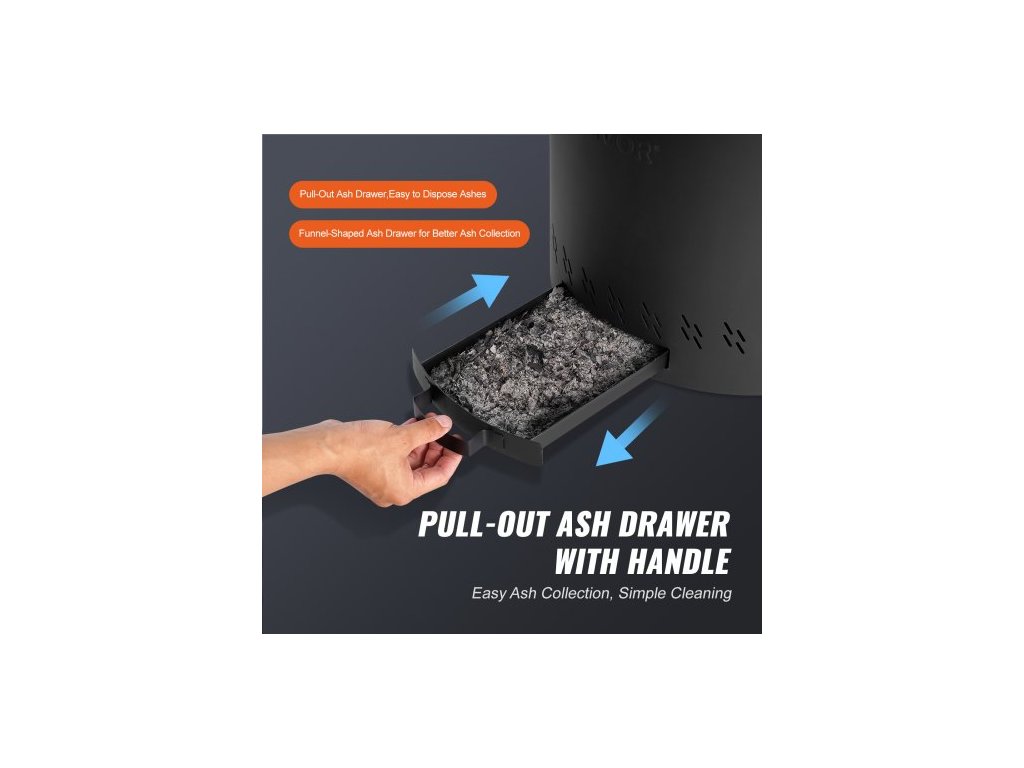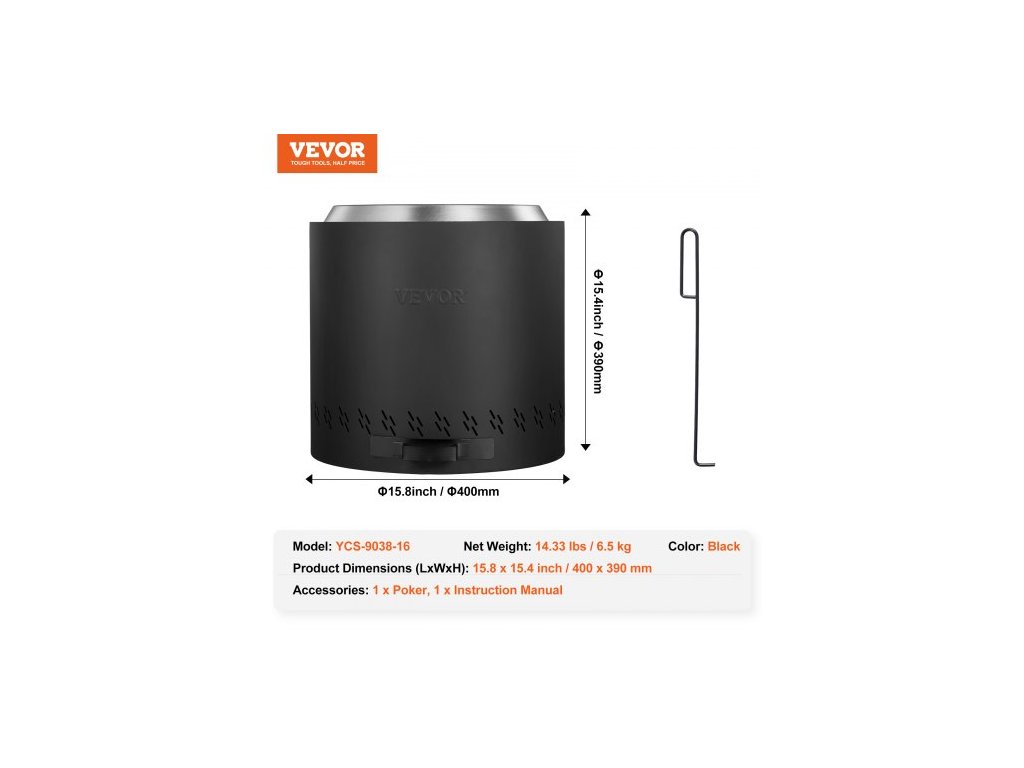 Rozměry výrobku (DxŠxV): Φ15,8 x 15,4 palce / Φ400 x 390 mm,Hlavní materiály: Vnitřní nerezová ocel SUS430, Vnější nerezová ocel Q235A,Barva: Černá,Model: YCS-9038-16,Povrchová úprava: Vysokoteplotní práškové lakování,Čistá hmotnost: 14,33 lbs / 6,5 kg,Konstrukce popelníku: Boční výsuv