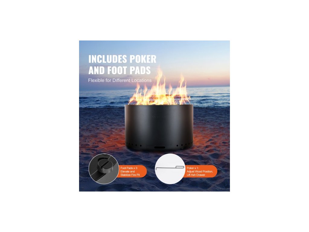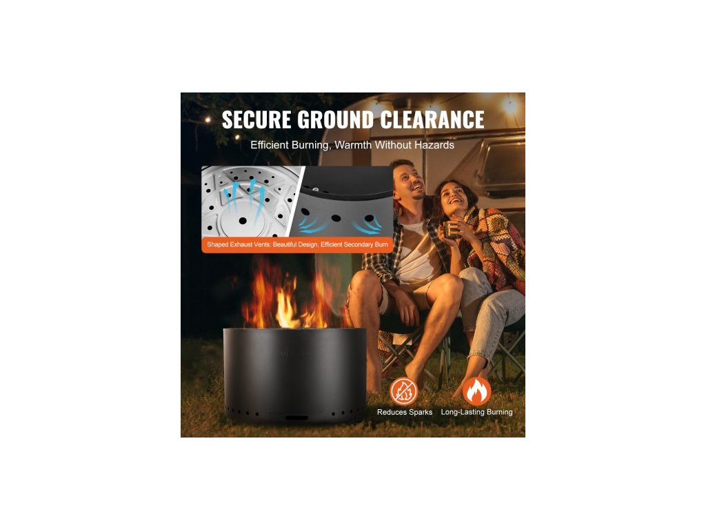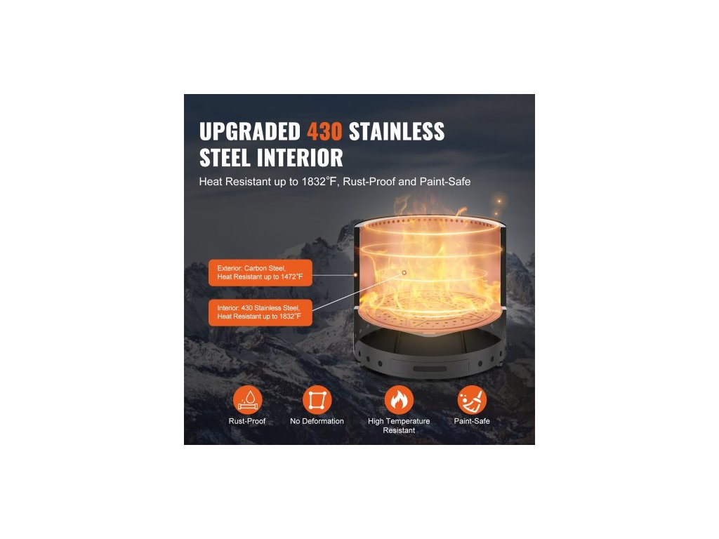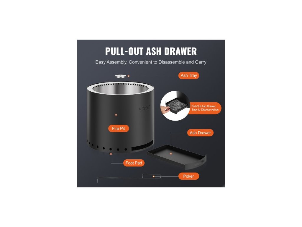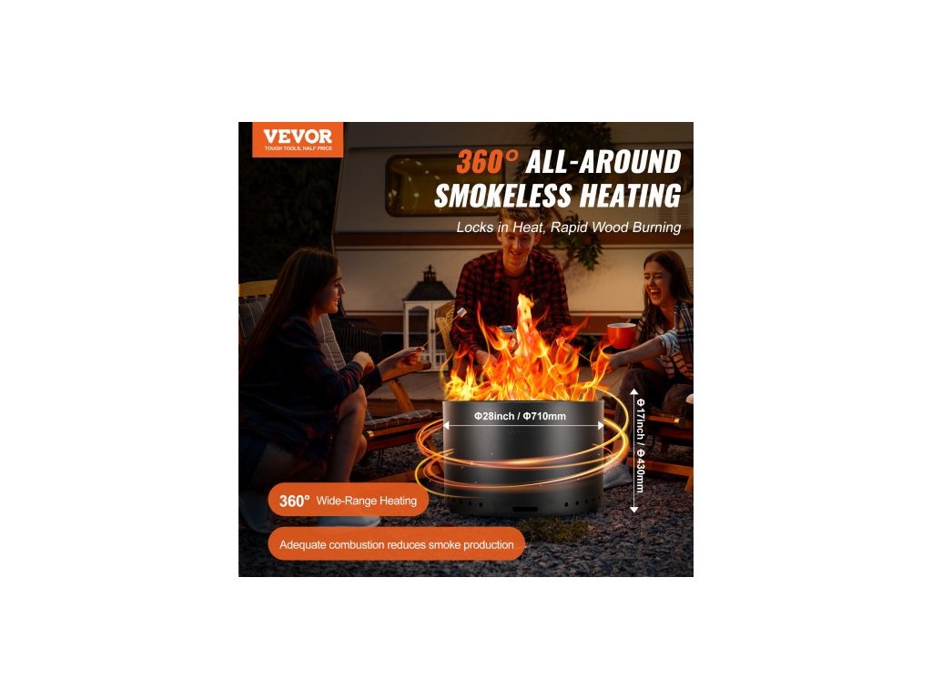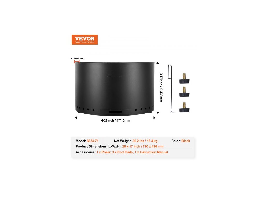 Bezdýmná ohniště, ohniště, dřevo, nerezová ocel, průměr 71,1 cm, bezdýmná technologie, rychlé a úplné spalování, snadné čištění, přenosné a lehké, všestranné použití, bezpečnostní záruka, rozměry výrobku (DxŠxV): Φ28 x 17,7 palce / Φ710 x 450 mm, hlavní materiály: vnitřní nerezová ocel SUS430, vnější nerezová ocel Q235A, barva: černá, model: 6834-71, povrchová úprava: vysokoteplotní práškové lakování, čistá hmotnost: 36,2 lbs / 16,4 kg, konstrukce popelníku: boční výsuvDoplňkové parametry
