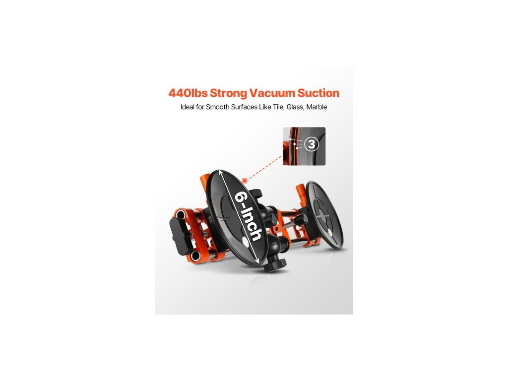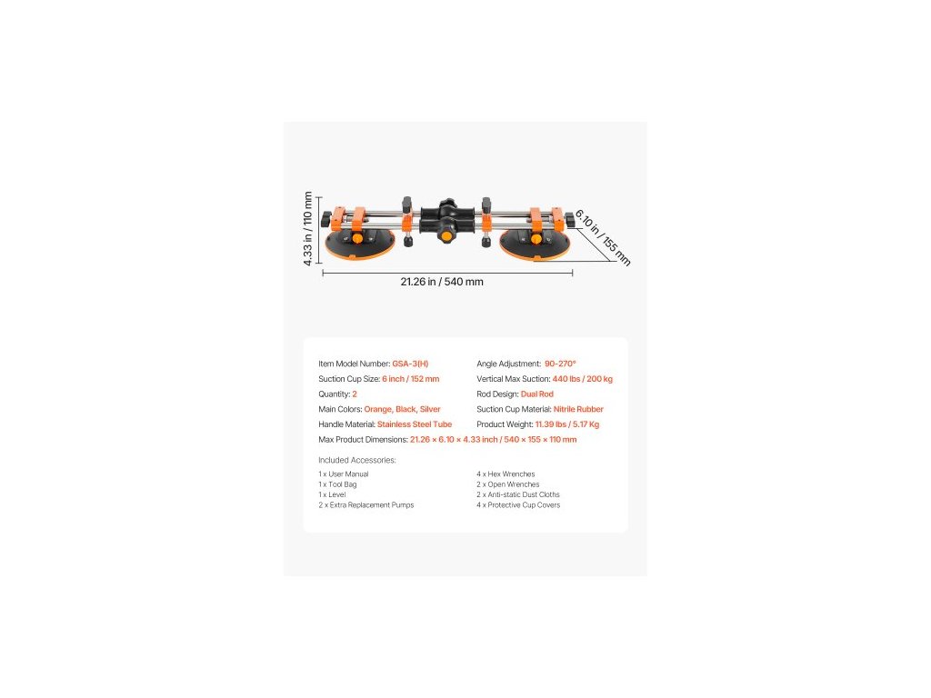 Nastavení úhlu: 90-270°,Maximální rozměry produktu: 21,65 × 6,10 × 4,33 palce / 550 × 155 × 110 mm,Velikost přísavky: 6 palců / 152 mm,Číslo modelu položky: GSA-3(H),Hmotnost produktu: 14,33 lbs / 6,5 kg,Množství: 2,Vertikální maximální sací síla: 440 lbs / 200 kg, Konstrukce tyče: Dvojitá tyč, Materiál přísavky: Nitrilová pryž, Hlavní barvy: Oranžová, Černá, Stříbrná, Modrá, Materiál rukojeti: Nerezová ocelová trubka