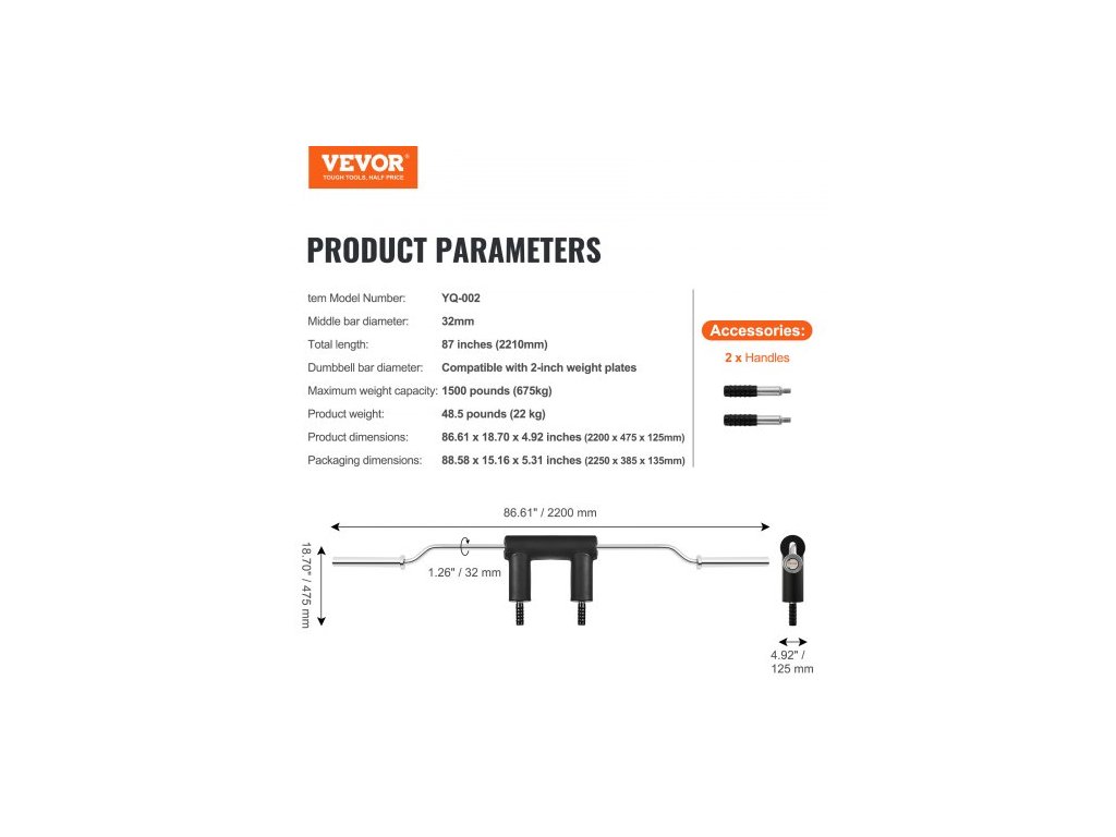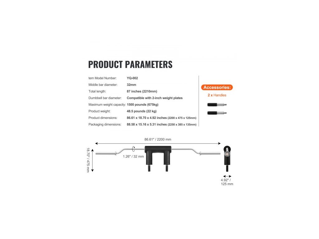 Celková délka: 87 palců / 2210 mm,Průměr střední tyče: 32 mm,Číslo modelu položky: YQ-002,Hmotnost výrobku: 48,5 liber / 22 kg,Maximální nosnost: 1500 liber / 675 kg,Rozměry balení: 88,58 x 15,16 x 5,31 palců / 2250 x 385 x 135 mm,Průměr činky: Kompatibilní s 2palcovými závažími,Produkt Rozměry: 86,61 x 18,70 x 4,92 palce / 2200 x 475 x 125 mm