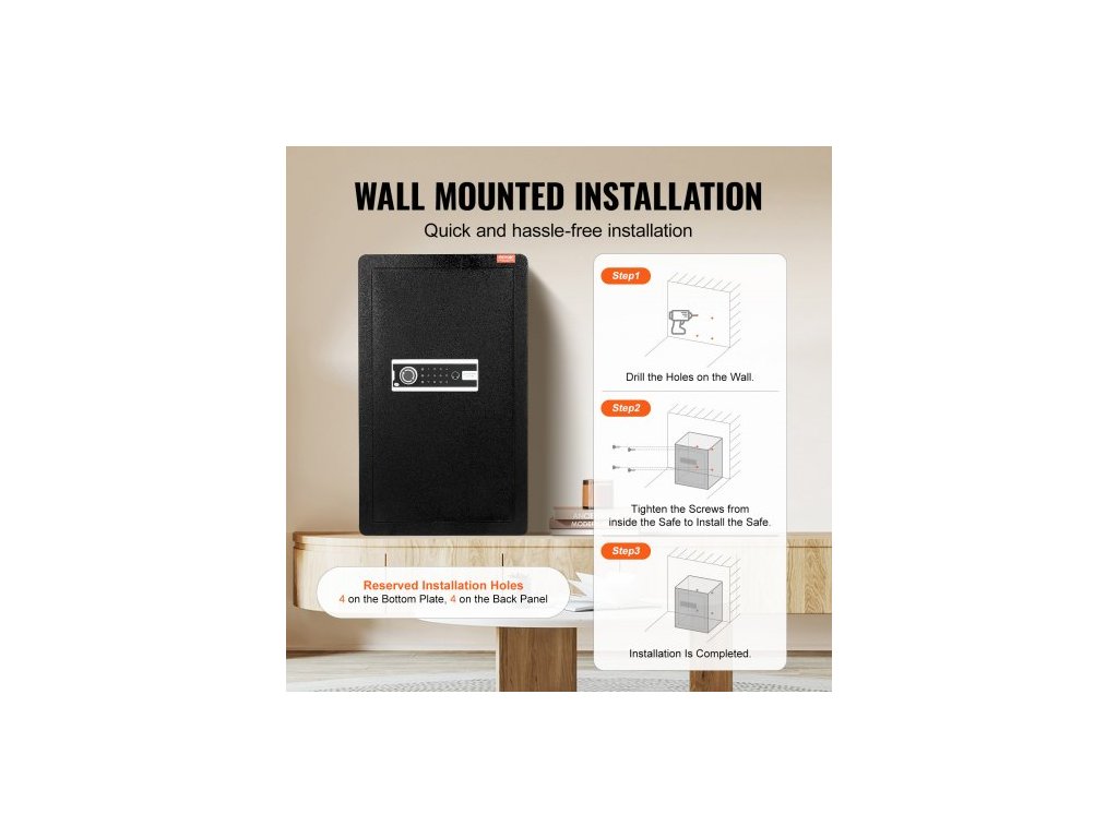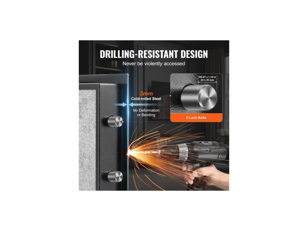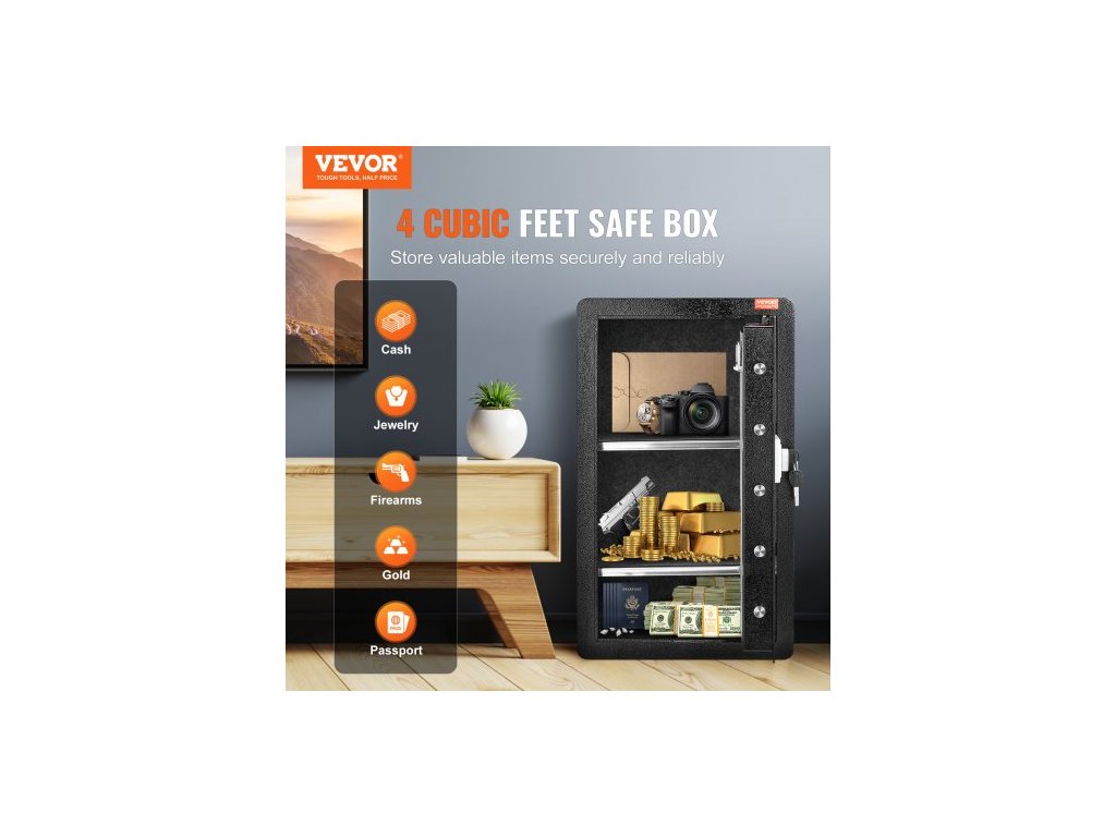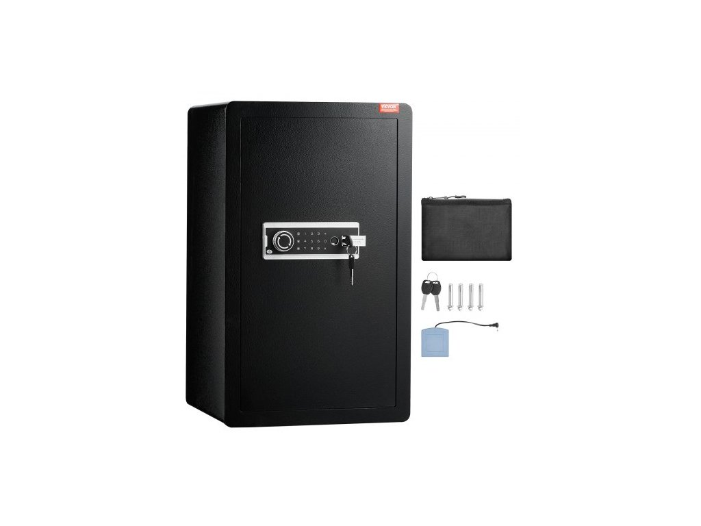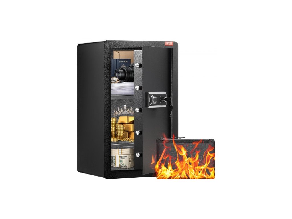 Bezpečnostní schránka s jedním dveřním systémem o objemu 113 l, zámkem na klíč, heslem a otiskem prstu, s nehořlavou taškou, věšákem na klíče, LED světlem a 2 policemi na peníze, dokumenty, šperky a cennosti, černá