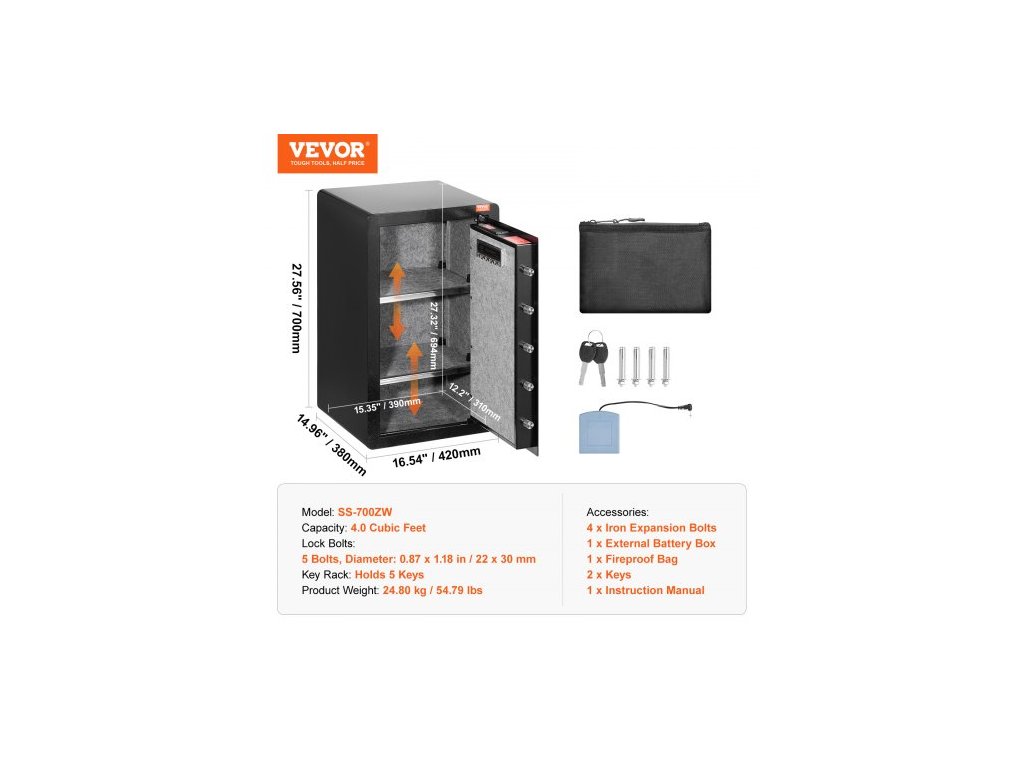 Počet závor: 5 závor, Průměr: 0,87 x 1,18 palce / 22 x 30 mm,Objem: 4,0 krychlových stop,Model: SS-700ZW,Hmotnost výrobku: 24,80 kg / 54,79 lbs,Věšák na klíče: Pojme 5 klíčů,Rozměry výrobku: 700 x 420 x 380 mm / 27,56 x 16,54 x 14,96 palce,Vnitřní rozměry: 625 x 345 x 375 mm / 24,60 x 13,58 x 14,76 palce
