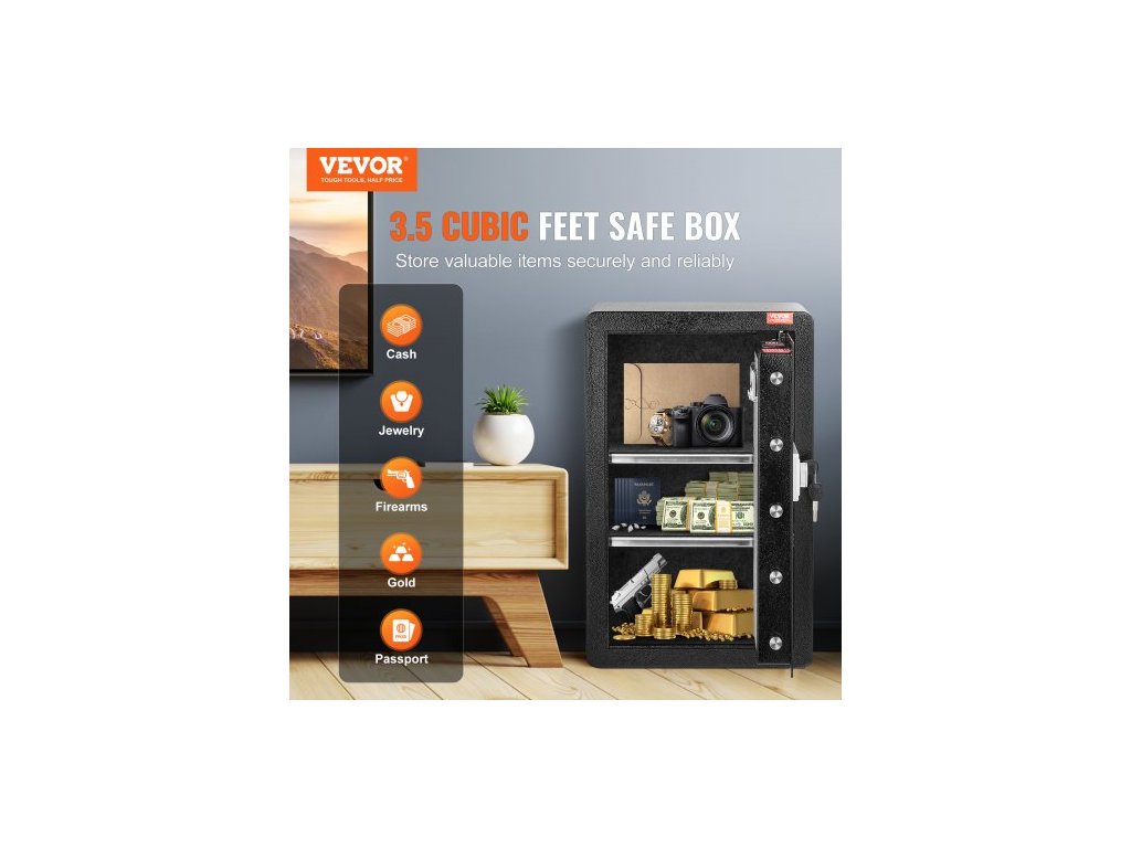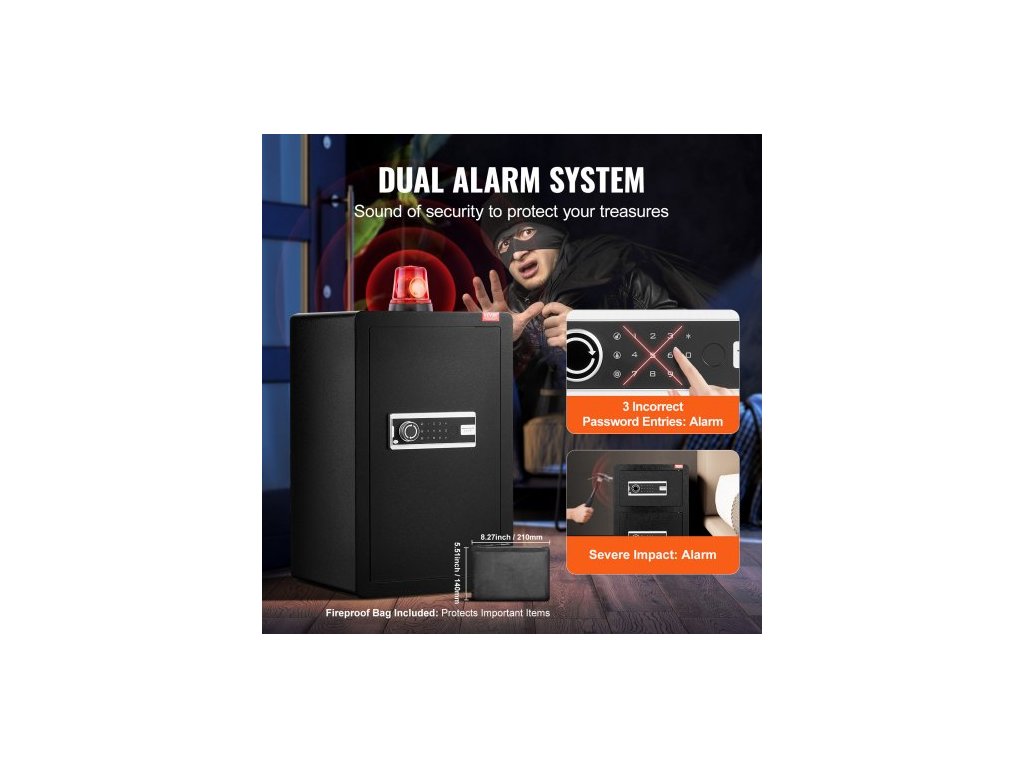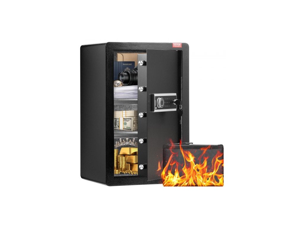 Bezpečnostní schránka s jedním dveřním systémem o objemu 99 l s klíčovým zámkem a heslem, uzamykatelná schránka s nehořlavou taškou, věšákem na klíče, LED osvětlením a 2 policemi na peníze, dokumenty, šperky a cennosti, černá
