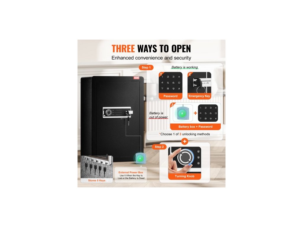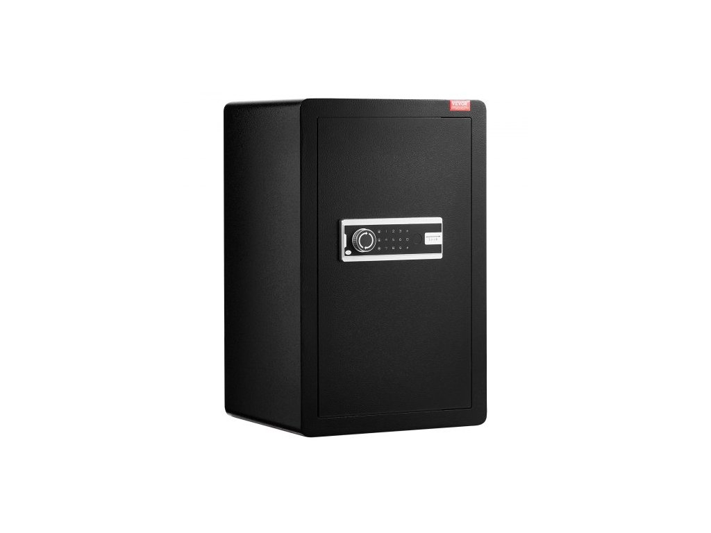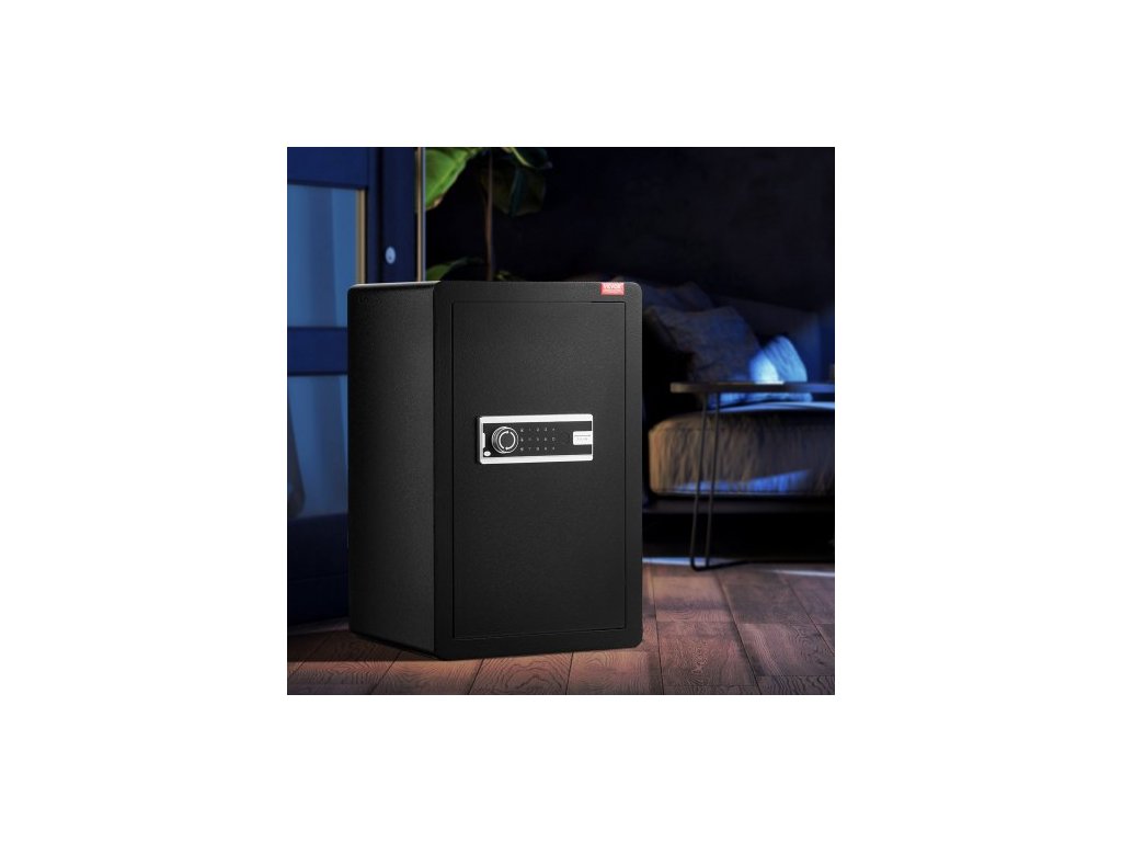 Trezor s jedním dveřmi o objemu 99 l, zámkem na klíč a heslem, bezpečnostní schránka s nehořlavou taškou, věšákem na klíče, LED světlem a 2 policemi na peníze, dokumenty, šperky a cennosti, černýPokročilá šifrovací technologie