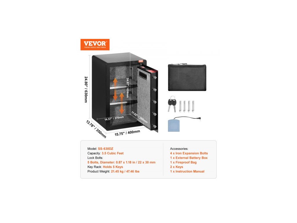 Počet závor: 5 závor, Průměr: 0,87 x 1,18 palce / 22 x 30 mm,Objem: 3,5 krychlových stop,Model: SS-630DZ,Otvory pro montáž na zeď: 4 na spodní desce, 4 na zadním panelu,Hmotnost výrobku: 21,45 kg / 47,46 lbs,Věšák na klíče: Pojme 5 klíčů,Rozměry výrobku: 630 x 400 x 350 mm / 24,80 x 15,75 x 13,78 palce, vnitřní rozměry: 550 x 325 x 345 mm / 21,65 x 12,80 x 13,58 palce