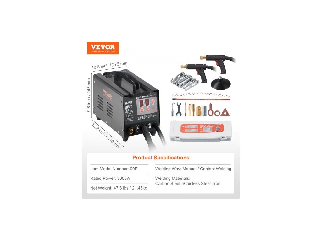 Svařovací materiály: uhlíková ocel, nerezová ocel, železo, číslo modelu: 90E, jmenovitý výkon: 3000 W, rozměry výrobku: 12,2 x 10,8 x 9,6 palce / 310 x 275 x 245 mm, hmotnost netto: 47,3 lbs / 21,45 kg, způsob svařování: ruční / automatické kontaktní svařování