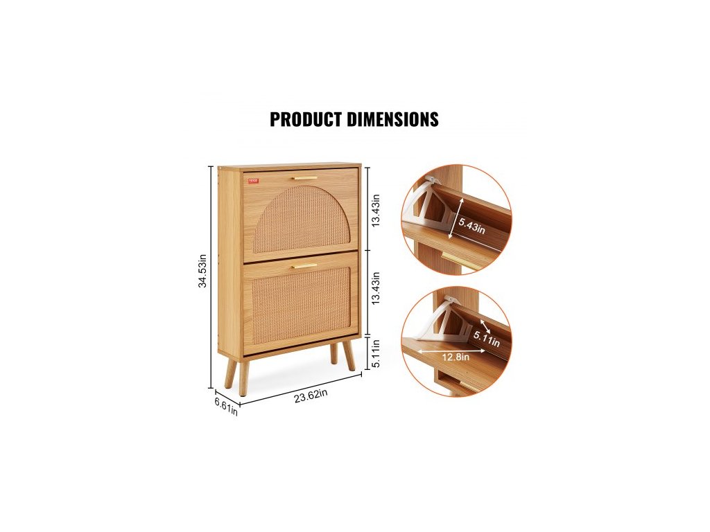 Typ: 2 výklopné zásuvky, Výška zásuvky: 13,43 palce/34,1 cm, Nosnost: ≥80 liber, Materiály: Dřevotříska, PVC ratan, Masivní dřevo, Číslo modelu položky: HZR001, Hmotnost výrobku: 28,01 liber/12,75 kg, Nohy skříňky: Kaučukovník s opěrkami, Materiál rukojeti: Hliníková slitina, Rozměry výrobku: 23,62 x 6,61 x 34,53 palce/600 x 168 x 877 mm