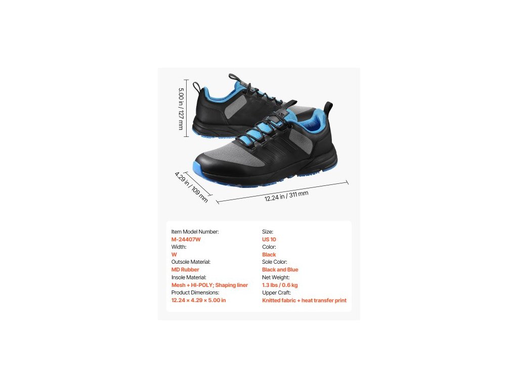 Velikost: US 10,Barva: Černá,Barva podrážky: Černá a modrá,Číslo modelu: M-24407W,Materiál podrážky: MD guma,Materiál stélky: Síťovina + HI-POLY; tvarující vložka,Rozměry produktu: 12,24 x 4,29 x 5,00 palců/311 x 109 x 127 mm,Šířka: Š,Svršek: Pletená tkanina + potisk s tepelným přenosem,Čistá hmotnost: 1,3 lbs/0,6 kg