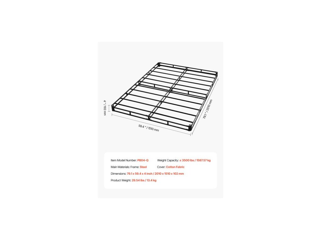 Hlavní materiály: Rám: ocel, Potah: bavlněná tkanina, Nosnost: ≤ 3500 liber / 1587,57 kg, Číslo modelu položky: PB04-Q, Hmotnost výrobku: 29,54 liber / 13,4 kg, Rozměry: 79,1 x 59,4 x 4 palce / 2010 x 1510 x 102 mm