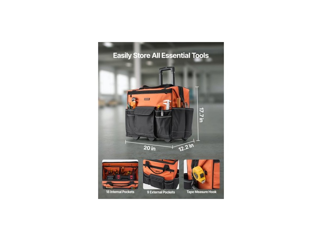 Brašna na nářadí na kolečkách, nosnost 45,5 kg, 27 kapes, odolná brašna na nářadí na kolečkách, nastavitelná teleskopická rukojeť a stabilní základna, organizéry na brašny na nářadí s kolečky pro stavebnictví, mechaniky