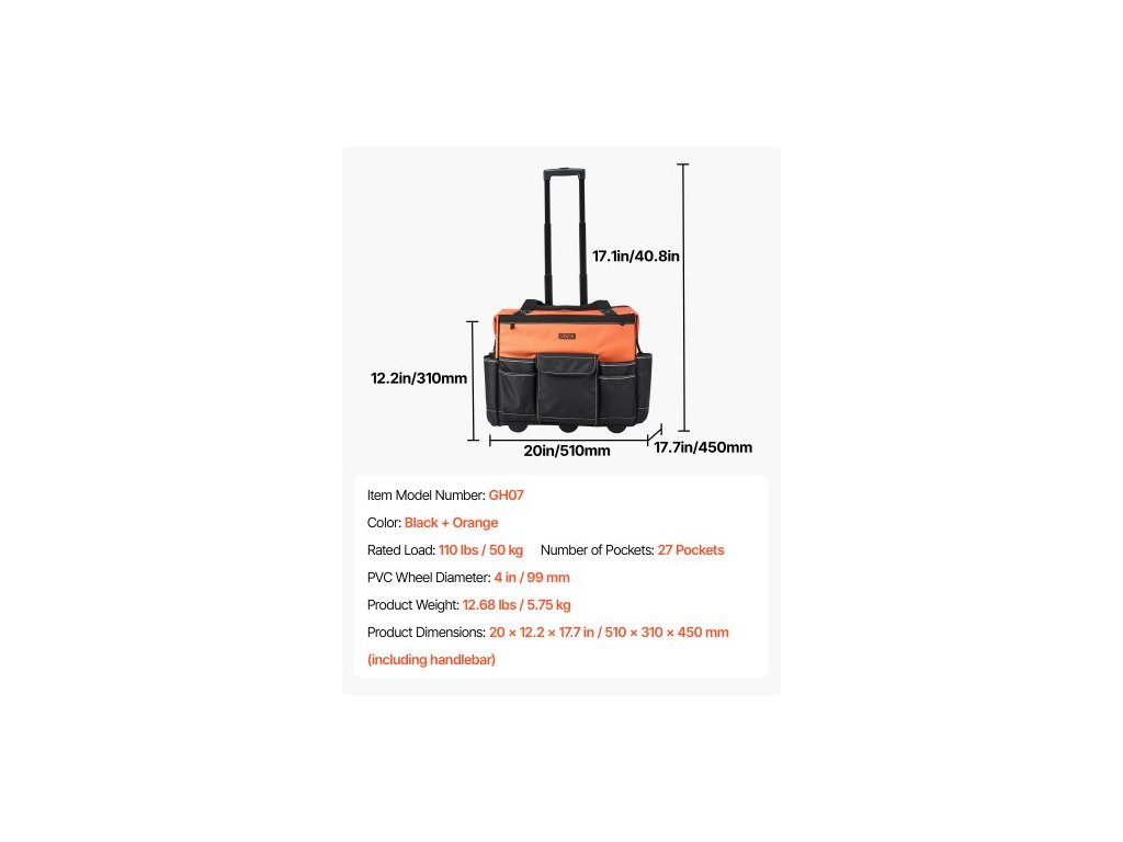 Minimální výška řídítek: 435 mm (od země),Barva: Černá + oranžová,Číslo modelu položky: GH07,Hmotnost výrobku: 5,75 kg,Maximální výška řídítek: 1035 mm (od země),Rozměry výrobku: 510 x 310 x 450 mm (včetně řídítek),Počet kapes: 27 kapes,Průměr koleček z PVC: 99 mm, Hlavní materiál: Vnější strana z polyesterové oxfordské tkaniny 1680D / vnitřní strana z polyesterové oxfordské tkaniny 600D, Jmenovité zatížení: 50 kg