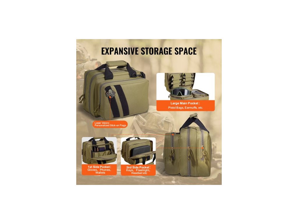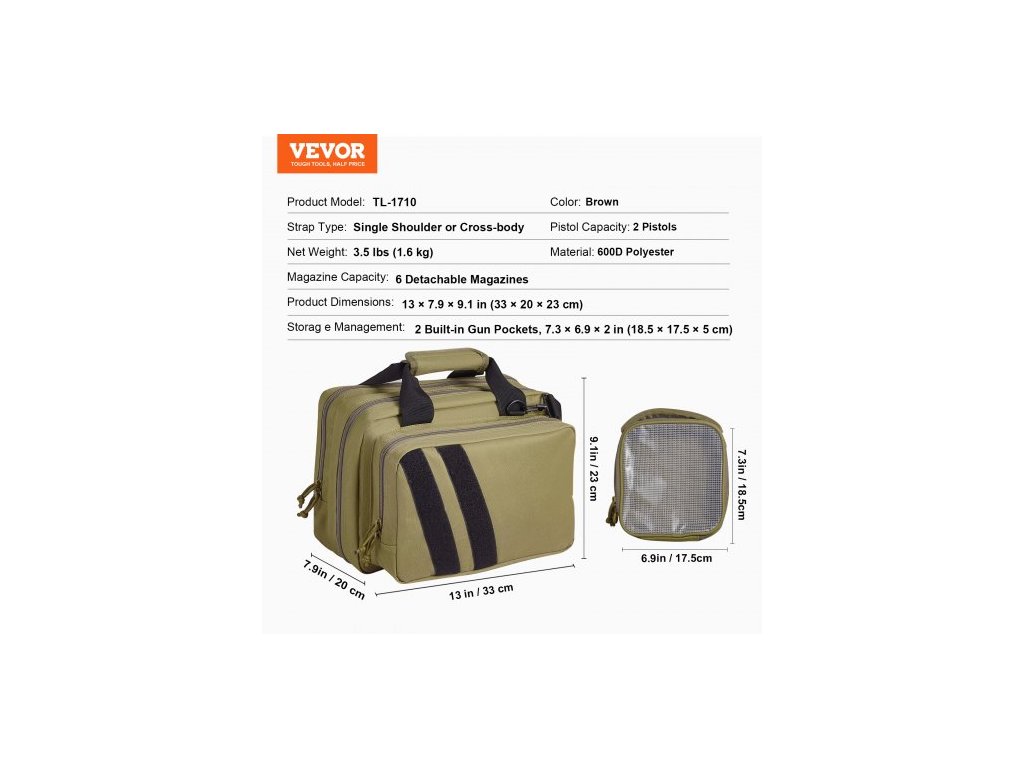 Kapacita zásobníků: 6 odnímatelných zásobníků, typ popruhu: přes rameno nebo přes rameno, kapacita pistole: 2 pistole, barva: hnědá, správa úložného prostoru: 2 vestavěné kapsy na zbraň, 7,3 × 6,9 × 2 palce (18,5 × 17,5 × 5 cm), model produktu: TL-1710, materiál: 600D polyester, rozměry produktu: 13 × 7,9 × 9,1 palce (33 × 20 × 23 cm), velikost popruhu: 1,5 × 55,1 palce (3,8 × 140 cm), Čistá hmotnost: 3,5 libry (1,6 kg)