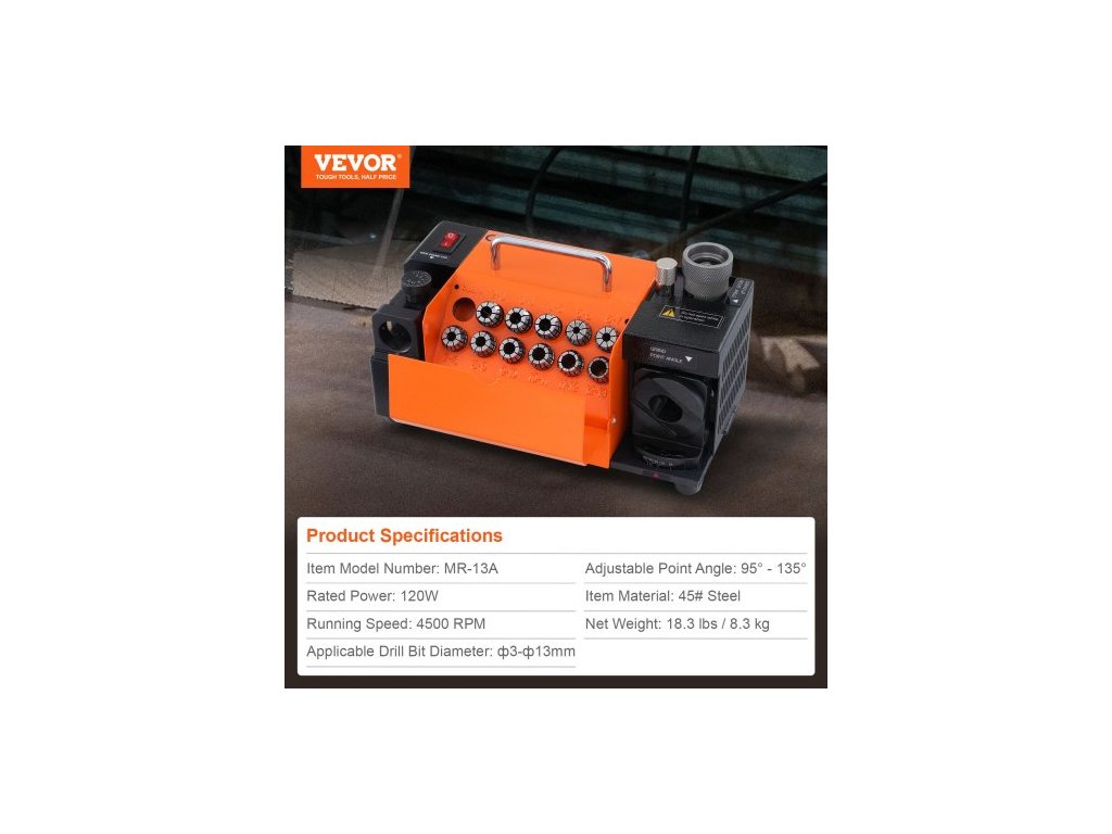 Použitelný průměr vrtáku: φ3-φ13 mm,Materiál výrobku: Ocel 45#,Nastavitelný úhel špičky: 95° - 135°,Otáčky: 4500 ot./min,Číslo modelu výrobku: MR-13A,Jmenovitý výkon: 120 W,Rozměry výrobku: 11,2'' x 5,3'' x 6,3'' / 285 x 135 x 160 mm,Čistá hmotnost: 19 liber / 8,6 kg