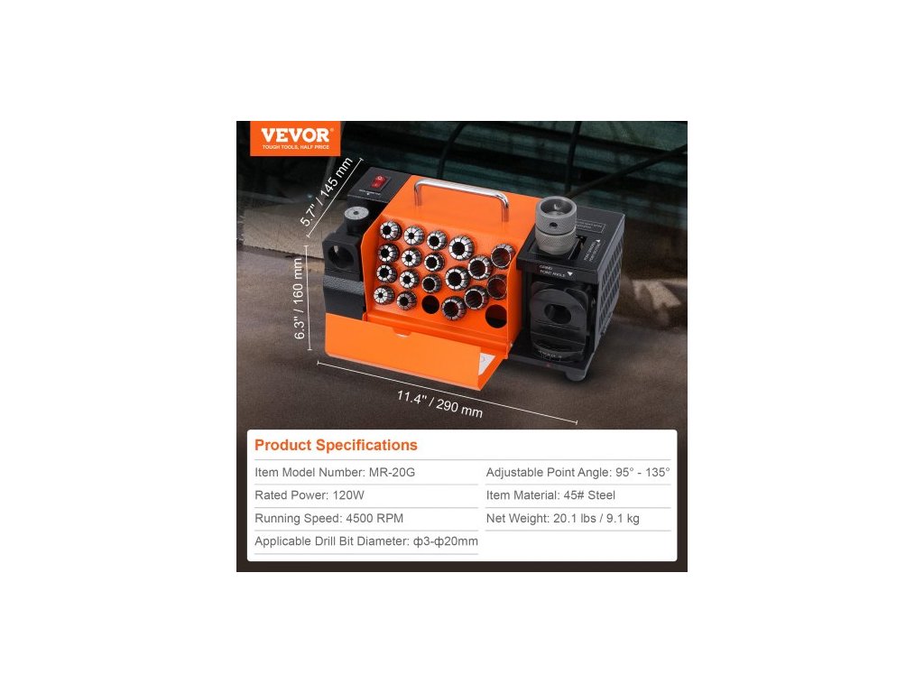 Použitelný průměr vrtáku: 3–20 mm,Materiál výrobku: Ocel 45#,Nastavitelný úhel špičky: 95°–135°,Otáčky: 4500 ot./min,Číslo modelu výrobku: MR-20G,Jmenovitý výkon: 120 W,Rozměry výrobku: 290 x 145 x 160 mm,Čistá hmotnost: 9,1 kg