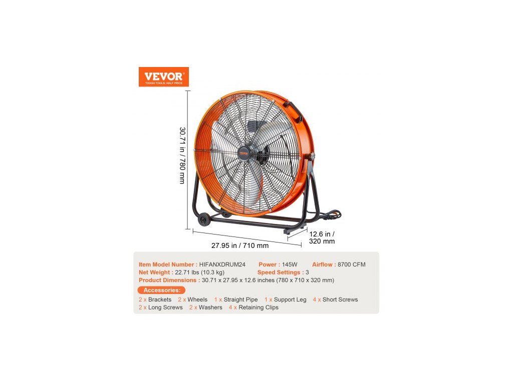 Průtok vzduchu: 8700 CFM,Číslo modelu položky: HIFANXDRUM24,Nastavení rychlosti: 3,Rozměry produktu: 30,71 x 27,95 x 12,6 palce (780 x 710 x 320 mm),Čistá hmotnost: 22,71 lbs (10,3 kg),Příkon: 145 W