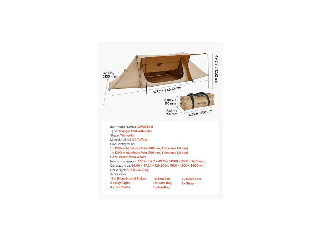 1 x 1,2 m hliníková tyč (Ø16 mm, tloušťka 1,0 mm):,1 x 1,3 m hliníková tyč (Ø16 mm, tloušťka 1,0 mm):,Typ: Trojúhelníkový stan s tyčemi,Tvar: Trojúhelníkový,Barva: Hnědá plátnová tkanina,Číslo modelu položky: DW258011,Konfigurace tyčí:,Plocha pokrytí: 1,5 x 1,2 x 3,3 m/59,06 x 47,24 x 129,92 palce,Rozměry produktu: 3300 × 1500 × 1200 mm / 129,92 × 59,06 × 47,24 palce, Čistá hmotnost: 3,70 kg / 8,15 lb, Hlavní materiál: Taft 210T