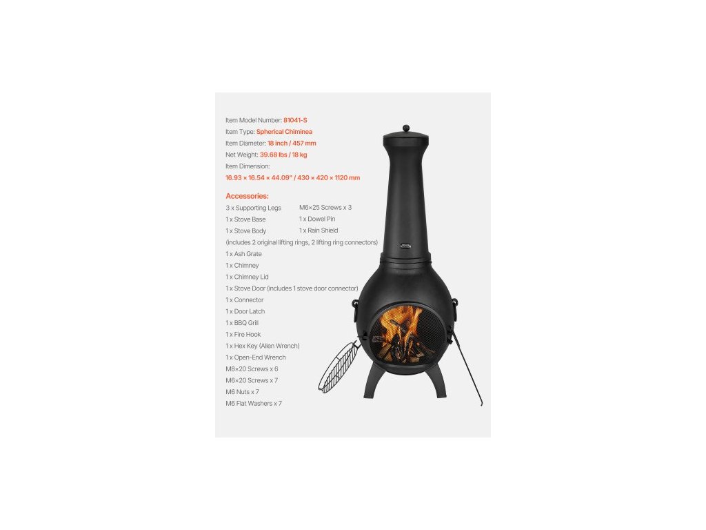 Rozměry výrobku: 16,93 x 16,54 x 44,09" / 430 x 420 x 1120 mm,Průměr výrobku: 18 palců / 457 mm,Barva: Černá,Číslo modelu výrobku: 81041-S,Typ výrobku: Kulovitý Chiminea,Čistá hmotnost: 39,68 lbs / 18 kg,Hlavní materiál: Hliník 6061