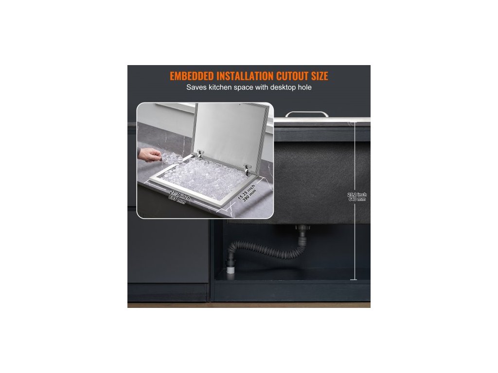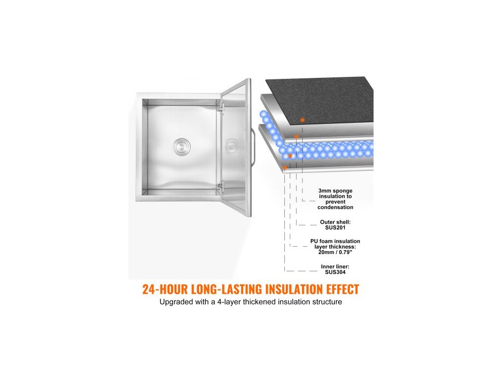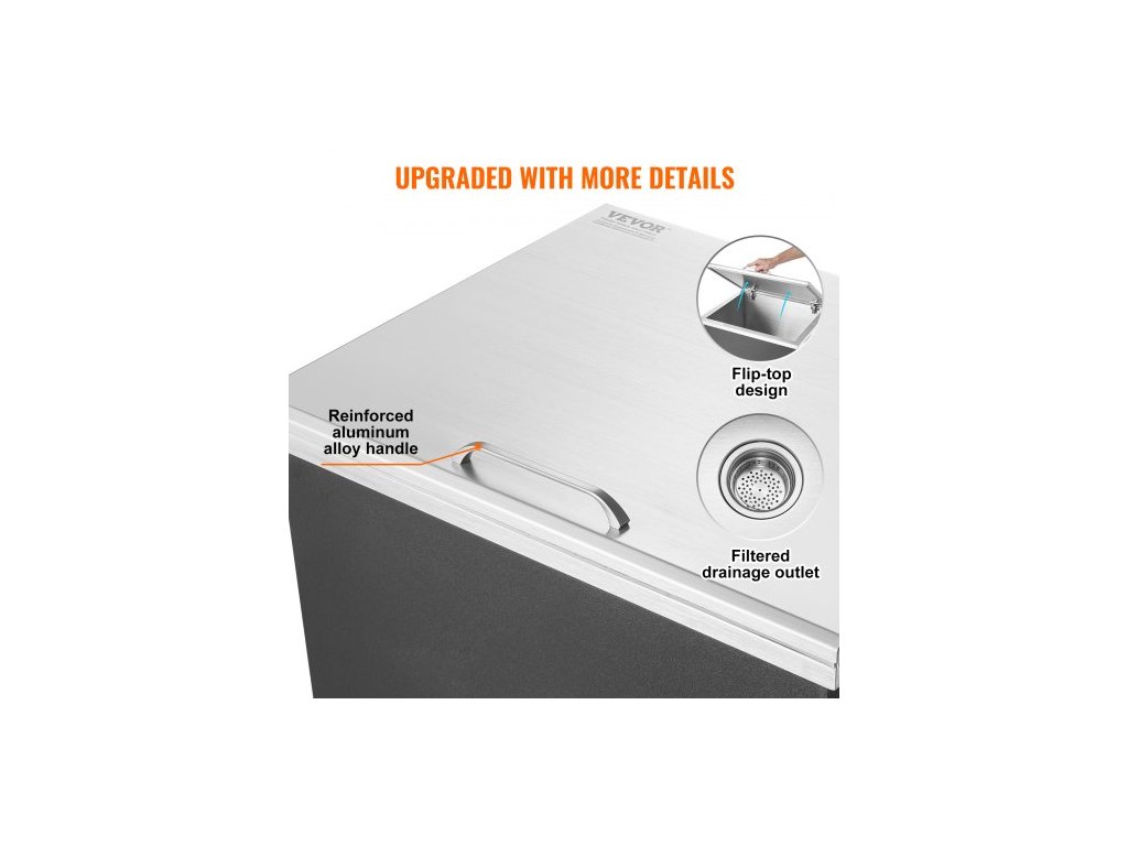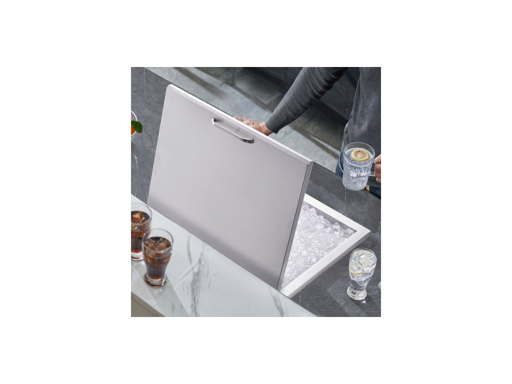 Chladič ledu , nerezový, 28"D x 16"Š x 17"V, komerční nádoba na led s výklopným víkem, venkovní kuchyňský ledový bar o objemu 40 qt, součástí balení je odtoková trubka a odtoková zátka, na studené víno a pivoZabudovaná nádoba na led