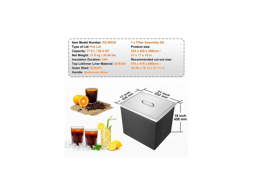 Materiál horního víka/vnitřní vložky: SUS304,Objem: 77,9 l / 82,4 qt,Číslo modelu položky: FG-SKU9,Vnější plášť: SUS201,Doba izolace: 24 hodin,Čistá hmotnost: 17,9 kg / 39,46 lbs,Rukojeť: Hliníková slitina